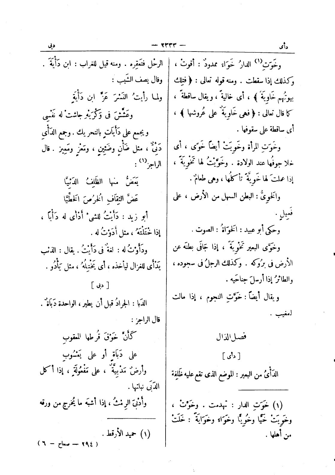 (*) الرحل فتَعقِره. ومنه قيل للغراب: ابن دأْيَةَ. وقال يصفُ الشَيب: ولما رأيتُ النَسْرَ عَزَّ ابن دأْيَةٍ * وعَشَّشَ في وَكْرَيْهِ جاشتْ له نَفْسي ويجمع على دأَياتٍ بالتحريك. وجمع الدأى دئى، مثل ضأن وضئين، ومعز ومعيز. قال الراجز (¬1) : يعض منها الظلف الدئيا * عض الثقاف الخرص الخطيا أبو زيد: دأيت للشئ أدأى له دأيا، إذا خْتَلْتَهُ، مثل أَدَوْتُ له. ودَأَوْتُ له: لغةٌ في دَأَيْتُ. يقال: الذئب يَدْأَى للغزال ليأخذه، أي يختله، مثل يأدو.