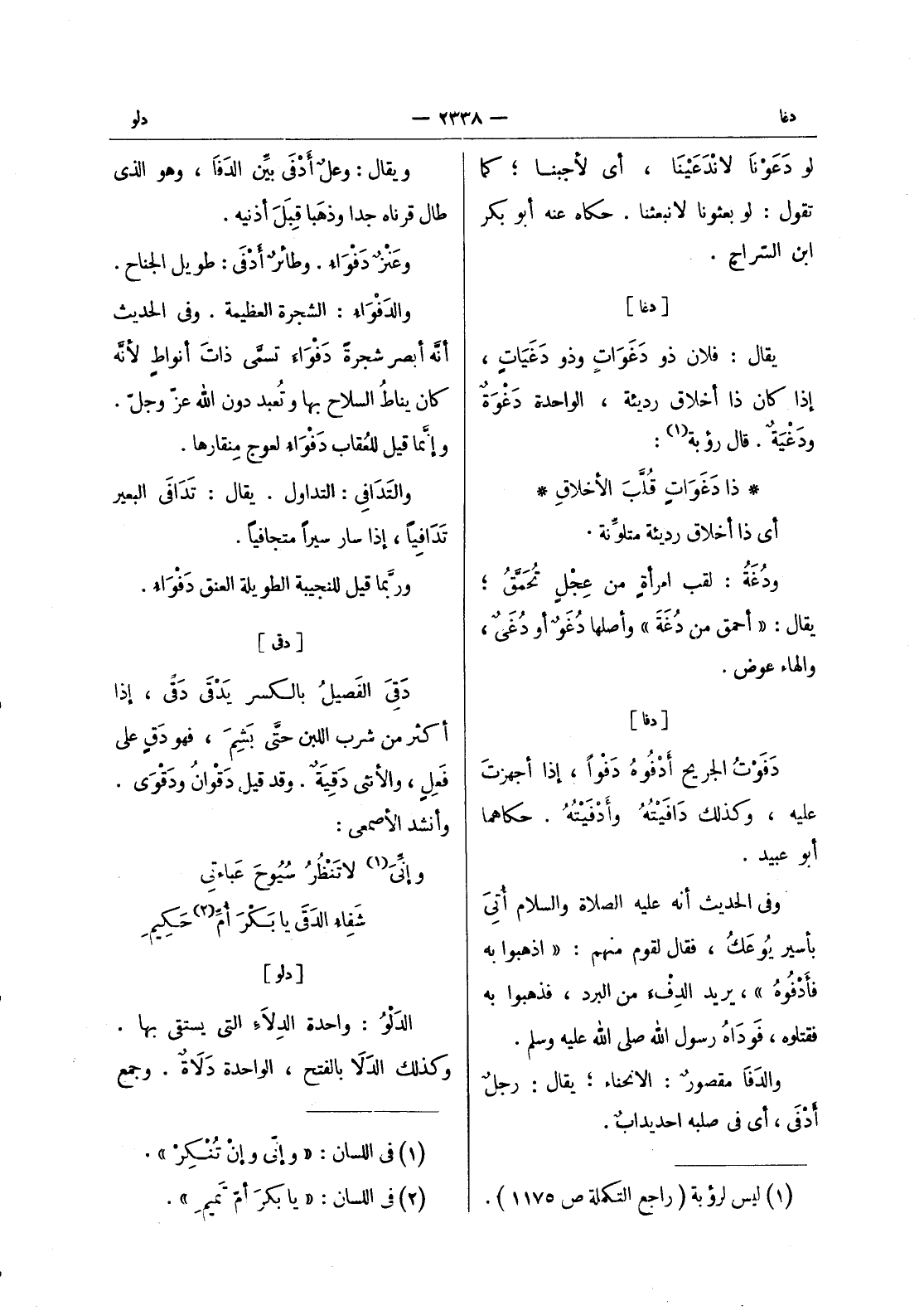 (*) ويقال: وعل أدفى بين الدَفا، وهو الذي طال قرناه جداً وذهَبا قِبَلَ أذنيه. وعَنْزٌ دَفْواءُ. وطائرٌ أَدْفى: طويل الجناح. والدفواء: الشجرة العظيمة. وفى الحديث أنه أبصر شجرة دفواء تسمى ذات أنواط لانه كان يناط السلاح بها وتعبد دون الله عزوجل. وإنما قيل للعُقاب دَفْواءُ لعوجِ منقارها. والتَدافي: التداول. يقال: تَدافى البعير تَدافِياً، إذا سار سيراً متجافياً. وربَّما قيل للنجيبة الطويلة العنق دَفْواءُ.