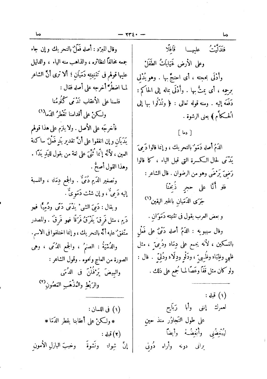 [دما] الدَمُ أصله دَمَوٌ بالتحريك، وإنما قالوا دَميَ يَدْمى لحال الكسرة التي قبل الياء، كما قالوا رَضيَ يَرْضى وهو من الرضوان. قال الشاعر: فلو أَنَّا على حجرٍ ذُبِحْنا * جَرى الدَمَيانِ بالخبر اليقين (¬1) وبعض العرب يقول في تثنيته دموان. وقال سيبويه: الدم أصله دمى على فعل بالتسكين، لانه يجمع على دماء ودمى، مثل ظبى وظباء ظبى، ودلو ودلاء ودلى. قال: ولو كان مثل وقفا وعصا لما جمع على ذلك.