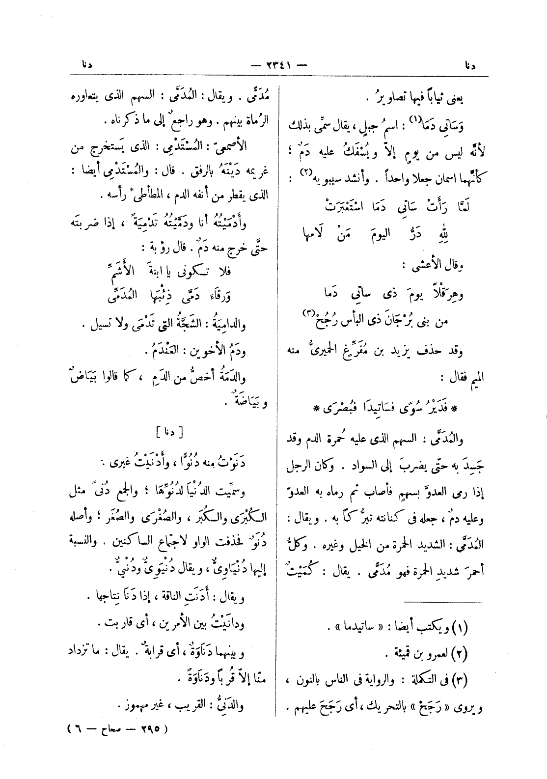 فدير سوى فساتيدا فبصرى * والمدمى: السهم الذى عليه حُمرة الدم وقد جَسِدَ به حتّى يضربَ إلى السواد. وكان الرجل إذا رمى العدوَّ بسهمٍ فأصاب ثم رماه به العدوّ وعليه دمٌ، جعله في كنانته تبر كابه. ويقال: المدمى: الشديد الحمرة من الخيل وغيره. وكلُّ أحمرَ شديد الحمرة فهو مُدَمَّى. يقال: كميث