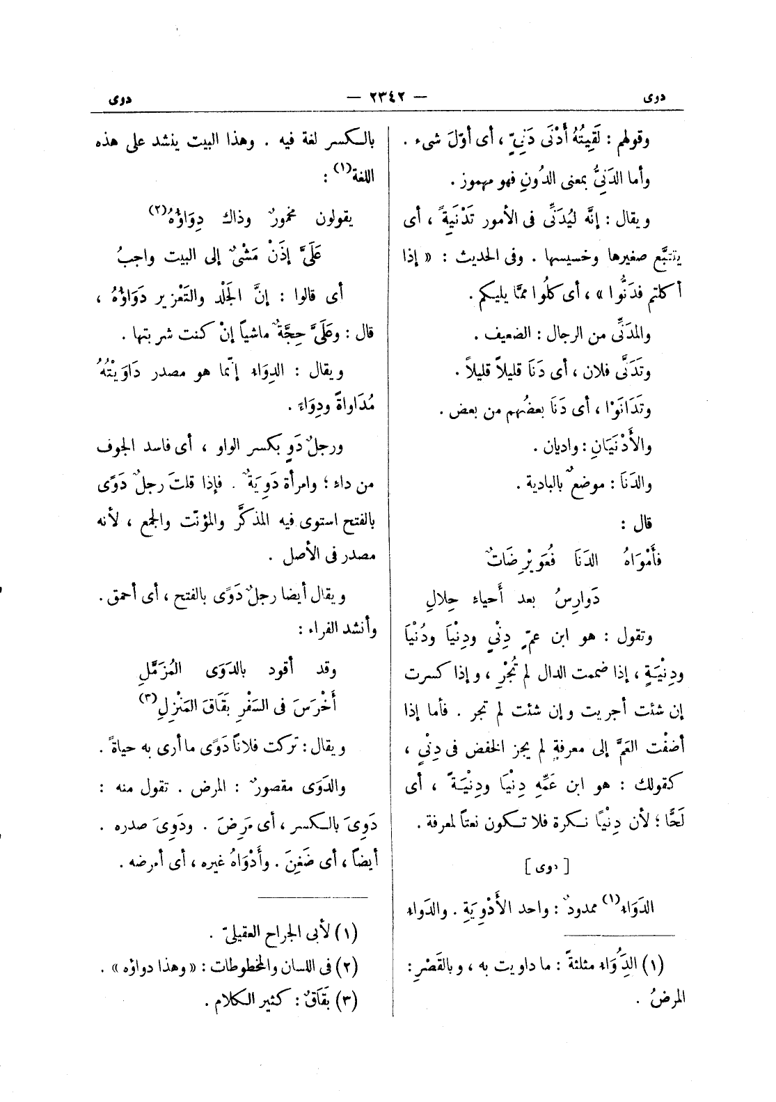 (*) بالكسر لغة فيه. وهذا البيت ينشد على هذه اللغة (¬1) : يقولون مخمورٌ وذاك دِواؤُهُ (¬2) * عَلَيَّ إذَنْ مَشْيٌ إلى البيت واجبُ أي قالوا: إن الجلد والتعزير دَواؤُهُ، قال: وعَلَيَّ حِجَّةٌ ماشياً إنْ كنت شربتها. ويقال: الدِواءُ إنّما هو مصدر داوَيْتُهُ مُداواةً ودِواءً. ورجلٌ دَوٍ بكسر الواو، أي فاسد الجوف من داءٍ، وامرأةٌ دَوِيَةٌ. فإذا قلتَ رجلٌ دَوّى بالفتح استوى فيه المذكَّر والمؤنّث والجمع، لأنه مصدر في الأصل. ويقال أيضاً رجلٌ دَوّي بالفتح، أي أحمق. وأنشد الفراء: وقد أقود بالدوى المزمل * أخرس في السفر بقاق المنزل (¬3) ويقال: تركت فلاناً دَوَىً ما أرى به حياةً. والدَوى مقصورٌ: المرض. تقول منه: دَوِيَ بالكسر، أي مَرِضَ. ودَويَ صدره. أيضاً أي ضَغِنَ. وأدواه غيره، أي أمرضه.