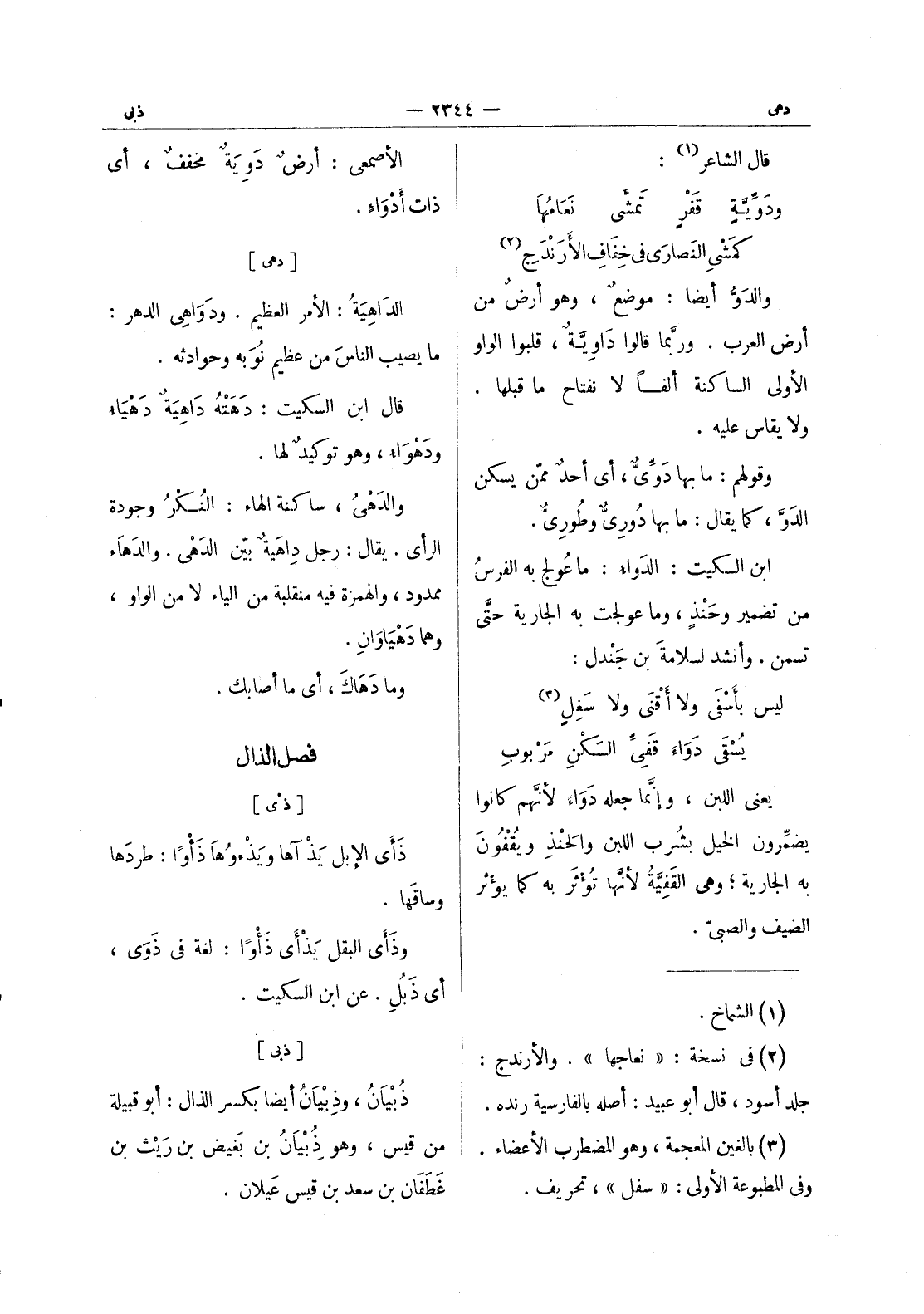 قال الشاعر (¬1) : ودوية قَفْرٍ تَمَشَّى نَعامُها * كمَشْيِ النَصارى في خفاف الارندج (¬2) والدو أيضا: موضع، وهو أرض من أرض العرب. وربما قالوا داوية، قلبوا الواو الاولى الساكنة ألفا لانفتاح ما قبلها. ولا يقاس عليه. وقولهم: ما بها دوى، أي أحد ممن يسكن الدو، كما يقال: ما بها دورِيٌّ وطورِيٌّ. ابن السكيت: الدَواءُ: ما عولج به الفرسُ من تضمير وحنذ، وما عولجت به الجارية حتى تسمن. وأنشد لسلامة بن جندل: ليس بأسفى ولا أقنى ولا سغل (¬3) * يُسْقَى دَواَء قَفِيِّ السَكْنِ مربوبِ يعنى اللبن، وإنما جعله دواء لانهم كانوا يضمرون الخيل بشرب اللبن والحنذ ويقفون به الجارية، وهى القفية لانها تؤثر به كما يؤثر الضيف والصبى.