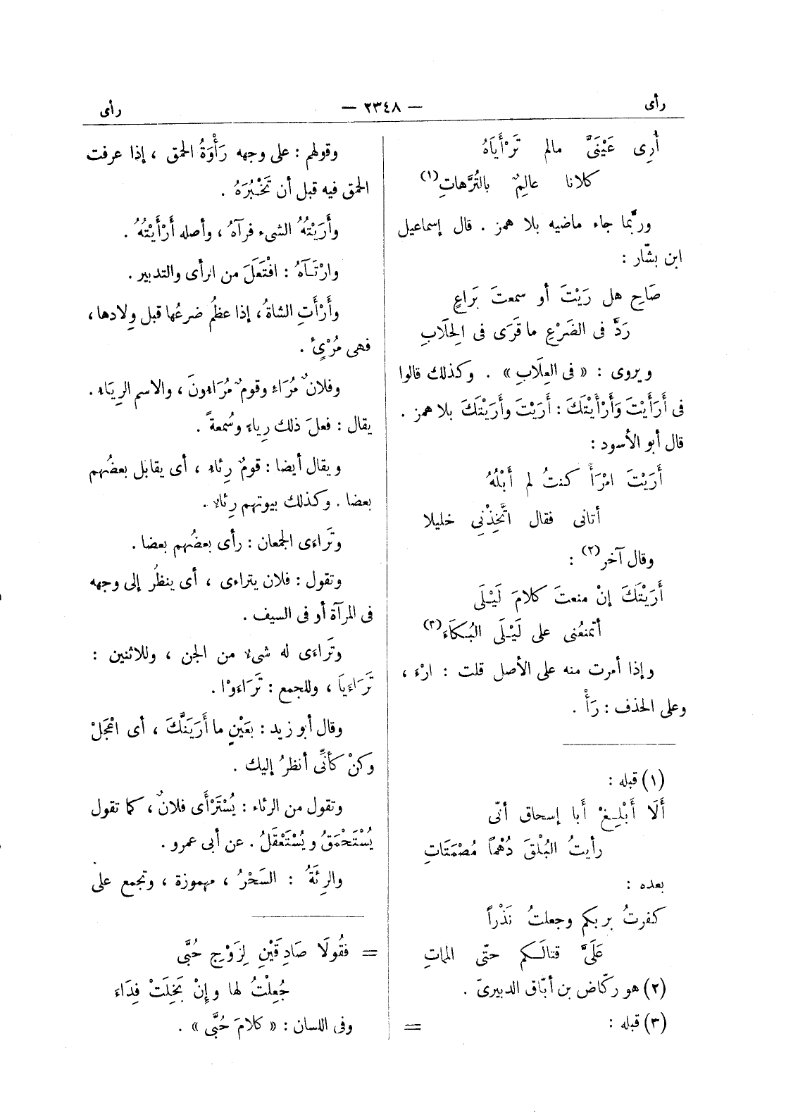 (*) وقولهم: على وجهه رَأْوَةُ الحمق، إذا عرفت الحمق فيه قبل أن تخبره. وأريته الشئ فرآه، وأصله أَرْأَيْتُهُ. وارْتَآهُ: افْتَعَلَ من الرأي والتدبير. وأَرْأَتِ الشاةُ، إذا عظُم ضرعُها قبل وِلادها، فهي مُرْئٍ. وفلانٌ مُراءٍ وقومٌ مُراءُونَ، والاسم الرِياءُ. يقال: فعلَ ذلك رِياءً وسُمعةً. ويقال أيضاً: قومٌ رِئاءٌ، أي يقابل بعضُهم بعضاً. وكذلك بيوتهم رِئاءٌ. وتَراءى الجمعان: رأى بعضُهم بعضاً. وتقول: فلان يتراءى، أي ينظُر إلى وجهه في المرآة أو في السيف. وتَراءَى له شئ من الجن، وللاثنين: تَراءَيا، وللجمع: تَراءَوْا. وقال أبو زيد: بعَيْنِ ما أَرَيَنَّكَ، أي اعْجَلْ وكنْ كأنِّي أنظرُ إليك. وتقول من الرئاء: يُسْتَرْأَى فلانٌ، كما تقول يستحمق ويستعقل. عن أبى عمرو. والرئة: السحر، مهموزة، وتجمع على