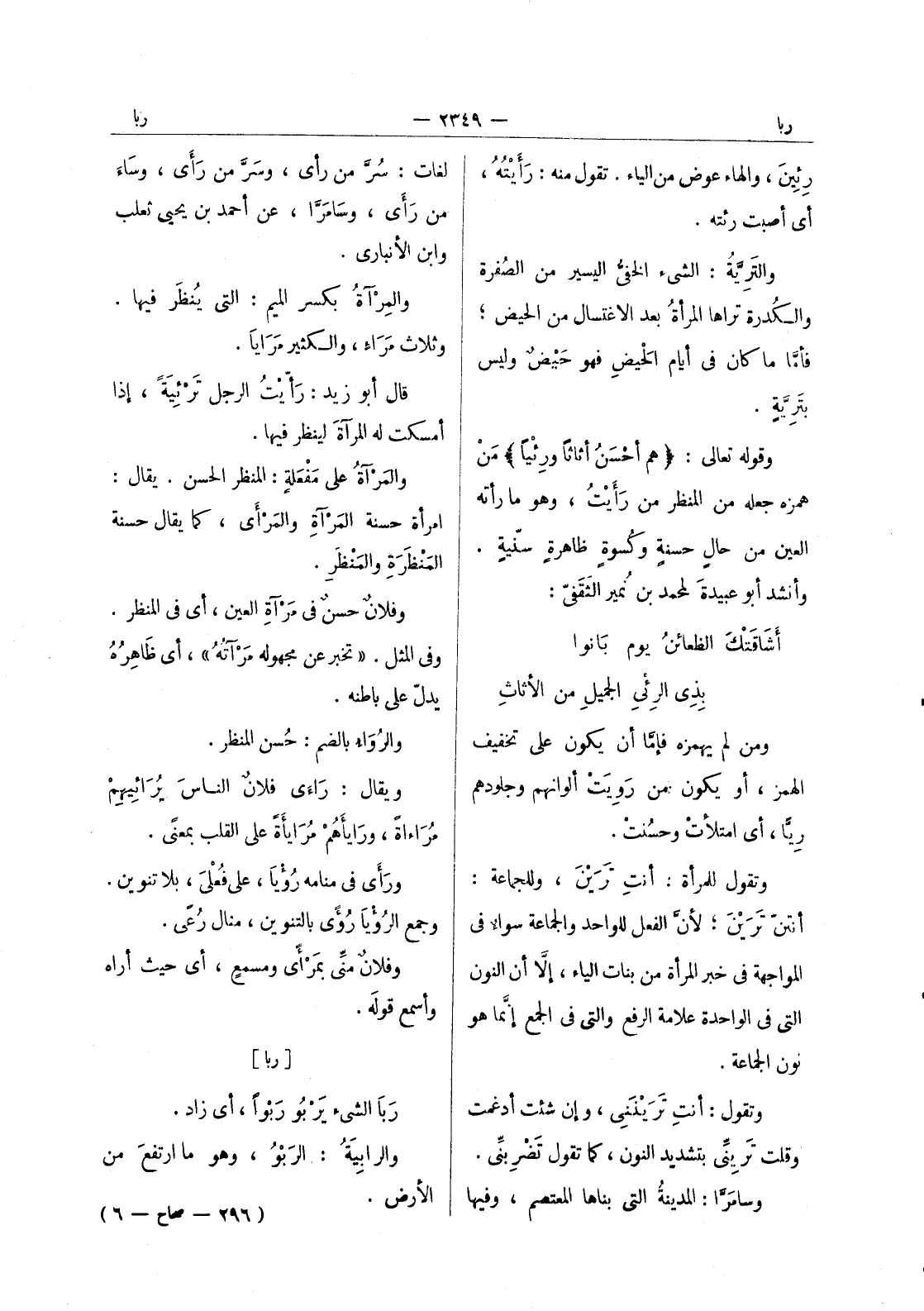 رئين، والهاء عوض من الياء. تقول منه: رَأَيْتُهُ، أي أصبت رئته. والترية: الشئ الخفى اليسير من الصُفْرة والكُدرة تراها المرأةُ بعد الاغتسال من الحيض ; فأما ما كان في أيام الحيض فهو حيض وليس بترية. وقوله تعالى: (هم أحسن أثاثاً ورِئْياً) مَنْ همزه جعله من المنظر من رأَيْتُ، وهو ما رأته العين من حالٍ حسنةٍ وكُسوةٍ ظاهرةٍ سنيَّةٍ. وأنشد أبو عبيدةَ لمحمد بنُ نُمير الثَقَفيّ: أشَاقَتْكَ الظعائنُ يوم بانوا * بِذي الرِئْي الجميلِ من الأثاثِ ومن لم يهمزه فإما أن يكون على تخفيف الهمز، أو يكون من رويت ألوانهم وجلودهم ريا، أي امتلات وحسنت. وتقول للمرأة: أنتِ تَرَيْنَ، وللجماعة: انتن ترين، لان الفعل للواحد والجماعة سواء في المواجة في خبر المرأة من بنات الياء، إلا أن النون التى في الواحدة علامة الرفع والتى في الجمع إنما هو نون الجماعة. وتقول: أنت تريننى، وإن شئت أدغمت وقلت تَرِينِّي بتشديد النون، كما تقول تَضْرِبنِّي. وسامرا: المدينة التى بناها المعتصم، وفيها