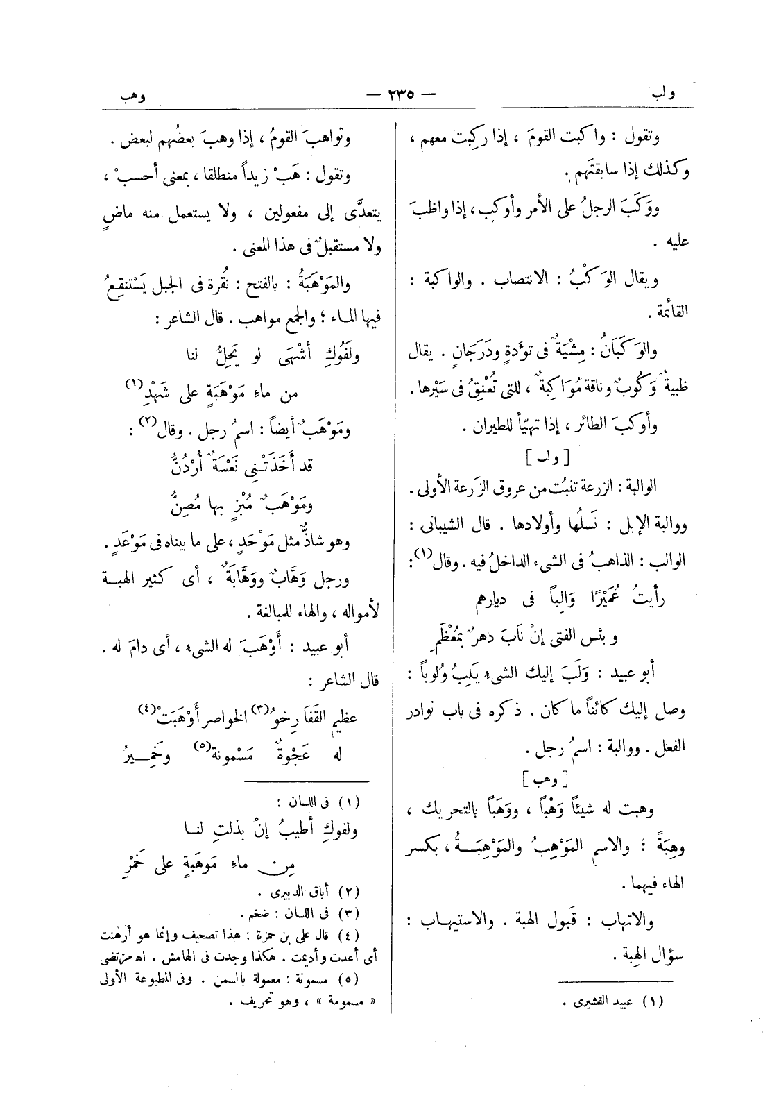 وتواهب القوم، إذا وهبَ بعضُهم لبعض. وتقول: هَبْ زيداً منطلقاً، بمعنى أحسبْ، يتعدَّى إلى مفعولين، ولا يستعمل منه ماضٍ ولا مستقبلٌ في هذا المعنى. والمَوْهِبَةُ: بالفتح: نُقرة في الجبل يَسْتَنْقِعُ فيها الماء، والجمع مواهب. قال الشاعر: ولَفوكِ أشْهى لو يَحِلُّ لنا * من ماءٍ موهبة على شهد (¬1) وموهب أيضا: اسم رجل. وقال (¬2) : قد أخذتنى نعسة أردن * وموهب مبز بها مصن * وهو شاذ مثل موحد، على ما بيناه في موعد. ورجل وهاب ووهابة، أي كثير الهبة لا مواله، والهاء للمبالغة. أبو عبيد: أَوْهَبَ له الشئ، أي دام له. قال الشاعر: عظيم القفا رِخْوُ (¬3) الخواصرِ أَوْهَبَتْ (¬4) * له عَجْوَةٌ مسمونة (¬5) وخمير