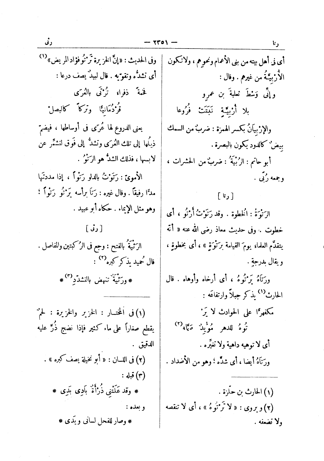[رتا] الرَتْوَةُ: الخُطْوة. وقد رَتَوْتُ أرتو، أي خطوت. وفى حديث معاذ رضى الله عنه " أنه يتقدم العلماء يوم القيامة برتوة "، أي بخطوة، ويقال بدرجة. ورتاه يرتوه، أي أرخاه وأوهاه. قال الحارث (¬1) يذكر جبلاً وارتفاعَه: مكفهرّاً على الحوادث لا يَرْ * تُوهُ للدهر مُؤَيِدٌ صَمَّاءُ (¬2) أي لا توهيه داهية ولا تغيِّره. ورَتاهُ أيضاً، أي شدَّهُ ; وهو من الأَضداد.