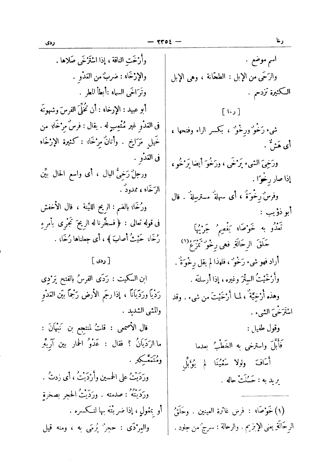 [رخا] شئ رخو ورخو، بكسر الراء وفتحها، أي هَشٌّ. ورَخيَ الشئ يرخى، ورخو أيضا يرخو، إذا صار رِخْواً. وفرسٌ رِخْوَةٌ، أي سهلةٌ مسترسِلةٌ. قال أبو ذؤيب: تَعْدو به خَوْصاءُ يَفْصِمُ جَرْيُها * حَلَقَ الرحالَةِ فهي رِخْوٌ تمزع (¬1) أراد فهو شئ رخو، فلهذا لم يقل رِخْوَةٌ. وأَرْخَيْتُ السِتْرَ وغيره، إذا أرسلتَه. وهذه أرخية، لما أرخيت من شئ. وقد استرخى الشئ. وقول طفيل: فَأَبَّلَ واسترخى به الخَطْبُ بعدما * أَسافَ ولولا سَعْيُنا لم يُؤَبِّل يريد به: حسنت حاله.