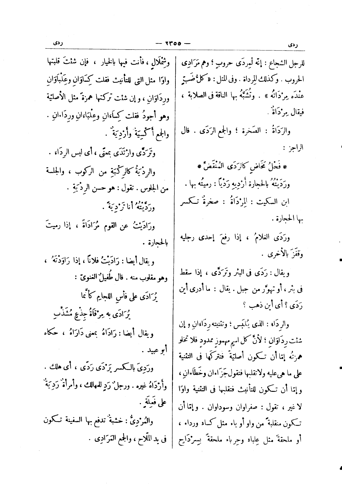 وشملال، فأنت فيها بالخيار، فإن شئت قلبتها واوا مثل التى للتأنيث فقلت كساوان وعلباوان ورداوان، وإن شئت تركتها همزة مثل الاصلية وهو أجود فقلت كساءان وعلباءان ورداءان. والجمع أكسية وأردية. وتردى وارتدى بمعنى، أي ليس الرداء. والردية كالركبة من الركوب، والجلسة من الجلوس. تقول: هو حسن الرِدْيَةِ. ورَدَّيْتُهُ أنا تَرْدِيَةً. ورادَيْتُ عن القوم مُراداةً، إذا رميتَ بالحجارة. ويقال أيضاً: راديت فلانا، إذا راودته، وهو مقلوب منه. قال طفيل الغنوى: يرادى على فأس اللجام كأنما * يرادى به مرقاة جذع مشذب ويقال أيضا: راداه بمعنى داراه، حكاه أبو عبيد. وردى بالكسر يَرْدى رَدىً، أي هلك. وأَرْداهُ غيره. ورجلٌ رَدٍ للمهالك، وامرأةٌ رَدِيَةٌ على فَعِلَةٍ. والمُرْدِيُّ: خشبةٌ تدفع بها السفينة تكون في يد الملاّح، والجمع المَرادي.