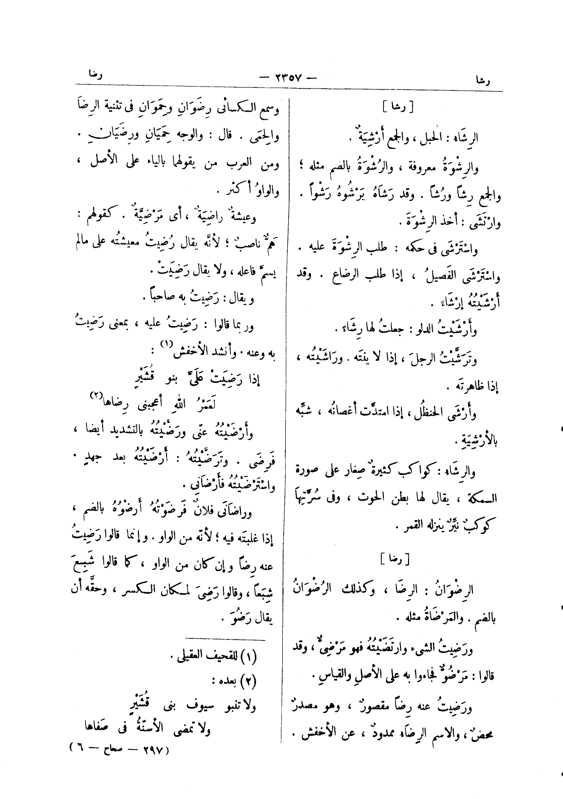 [رشأ] الرِشاءُ: الحبل، والجمع أَرْشِيَةٌ. والرِشْوَةُ معروفة، والرُشْوَةُ بالضم مثله ; والجمع رِشاً ورُشاً. وقد رَشاهُ يَرْشوهُ رَشْواً. وارْتَشى: أخذ الرِشْوَةَ. واستَرْشى في حكمه: طلب الرشْوَةَ عليه. واسْتَرْشى الفَصيلُ، إذا طلب الرضاع. وقد أَرْشَيْتُهُ إرْشاءً. وأَرْشَيْتُ الدلو: جعلتُ لها رِشاءً. وتَرَشَّيْتُ الرجلُ، إذا لاينتَه. وراشَيْتُه، إذا ظاهرتَه. وأَرْشى الحنظلُ، إذا امتدَّت أغصانُه، شبِّه بالأرْشِيَةِ. والرِشاءُ: كواكبٌ كثيرةٌ صِغار على صورة السمكة، يقال لها بطن الحوت، وفي سُرَّتِها كوكبٌ نيِّرٌ ينزله القمر.