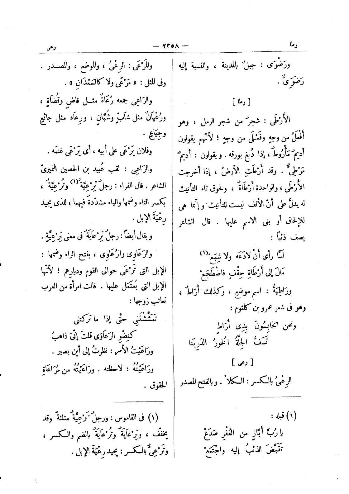 (*) والمرعى: الرعى، والموضع، والمصدر. وفي المثل: " مَرْعىً ولا كالسَعْدانِ ". والراعي جمعه رعاة مثل قاض وقضاة، ورعيان مثل شاب وشبان، ورعاء مثل جائع وجياع. وفلان يرعى على أبيه، أي يَرْعى غَنَمه. والراعي: لقب عبيد بن الحصين النميري الشاعر. قال الفراء: رجلٌ تَرْعِيَّةٌ (¬1) وتُرْعِيَّةٌ، بكسر التاء وضمها والياء مشددة فيهما، للذي يجيد رِعْيَة الإبل. ويقال أيضاً: رجلٌ تِرْعايَةٌ في معنى ترعية. والرعاوى والرعاوى، بفتح الراء وضمها: الإبل التي تَرْعى حوالي القوم وديارِهم ; لأنّها الإبل التي يعتمل عليها. قالت امرأة من العرب تعاتب زوجها: تمششتنى حتى إذا ما تركتني * كنضو الرعاوى قلت إنى ذاهب وراعيت الامر: نظرت إلى أين يصير. وراعيته: لاحظته. وراعَيتُهُ من مراعاة الحقوق.