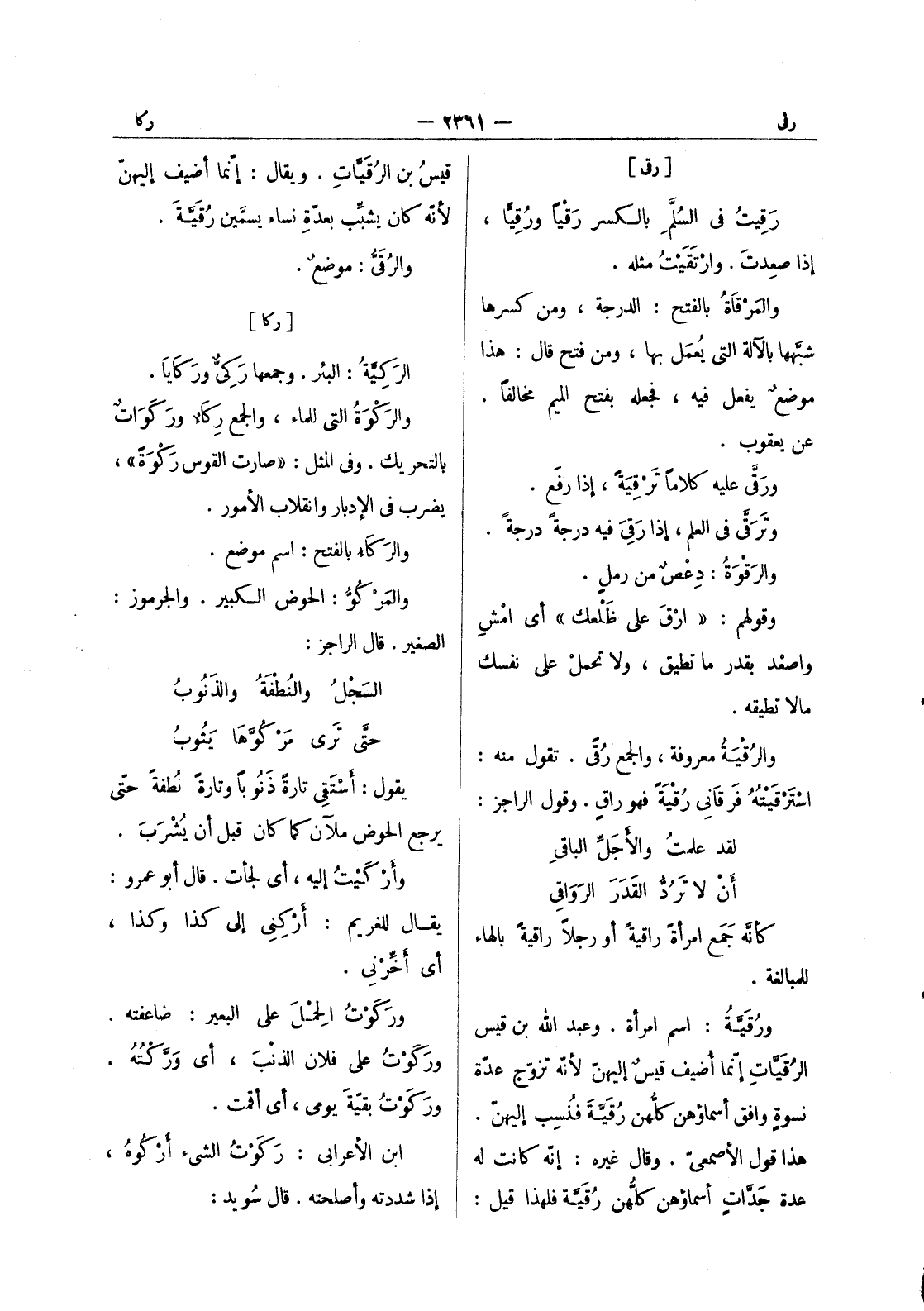 [رقى] رَقيتُ في السُلّمِ بالكسر رَقْياً ورُقِيَّا، إذا صعِدتَ. وارْتَقَيتُ مثله. والمرقاة بالفتح: الدرجة، ومن كسرها شبهها بالآلة التى يعمل بها، ومن فتح قال: هذا موضع يفعل فيه، فجعله بفتح الميم مخالفا. عن يعقوب. ورقى عليه كلاماً تَرْقِيَةً، إذا رفع وتَرَقَّى في العلم، إذا رَقٌيَ فيه درجة درجة. والرقوة: دعص من رملٍ. وقولهم: " ارْقَ على ظَلْعِكَ " أي امْشِ واصْعد بقدر ما تطيق، ولا تحملْ على نفسك ما لا تطيقه. والرُقْيَةُ معروفة، والجمع رُقىً. تقول منه: اسْتَرْقَيْتُهُ فرقانى رقية فهو راق. وقول الراجز: لقد علمت والاجل الباقي * أن لا ترد القدر الرواقى كأنه جمع امرأة راقية أو رجلا راقية بالهاء للمبالغة. ورقية: اسم امرأة. وعبد الله بن قيس الرقيات إنما أضيف قيس إليهن لانه تزوج عدة نسوة وافق أسماؤهن كلهن رقية فنسب إليهن. هذا قول الاصمعي. وقال غيره: إنه كانت له عدة جدات أسماؤهن كلهن رقية فلهذا قيل: