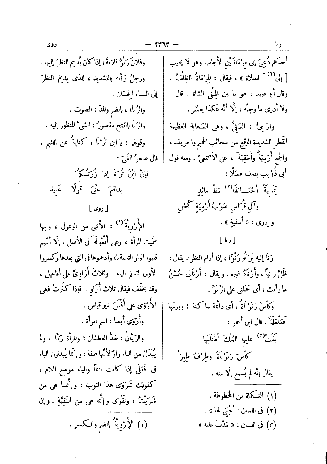 [روى] الإرْوِيّة (¬1) : الأنثى من الوعول، وبها سميت المرأة، وهى أفعولة في الاصل، إلا أنهم قلبوا الواو الثانية ياء وأدغموها في التى بعدها وكسروا الاولى لتسلم الياء. وثلاث أراوى على أفاعيل، وقد يخفف فيقال ثلاث أراو. فإذا كثرت فهى الاروى على أفعل بغير قياس. وأروى أيضا: اسم امرأة. والرَيَّانُ: ضدُّ العطشان ; والمرأة رَيَّا، ولم يبدل من الياء واو لانها صفة، وإنما يبدلون الياء في فعلى إذا كانت اسما والياء موضع اللام، كقولك شروى هذا الثوب، وإنما هي من شريت، وتقوى وإنما هي من التقية. وإن