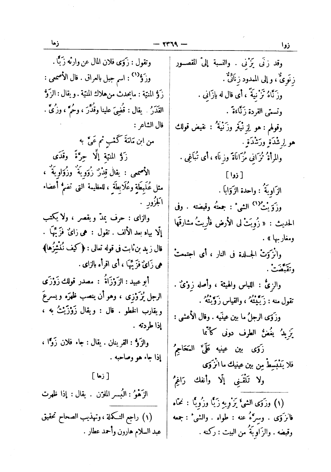 (*) وتقول: زوى فلان المال عن وارثه زيا. وزؤ (¬1) : اسم جبل بالعراق. قال الاصمعي: زؤ المنية: ما يحدث من هلاك المنية. ويقال: الزؤ القَدَرُ. يقال: قُضِيَ علينا وقُدِّرَ، وحُمَّ، وزُيَّ. قال الشاعر: من ابن مامَةَ كَعْبٍ ثم عَيَّ به * زؤ المنية إلا حرة وقدى الاصمعي: يقال قدر زووية وزواوية، مثل علبطة وعلابطة، للعظيمة التى تضم أعضاء الجزور. والزاى: حرف يمد ويقصر، ولا يكتب إلا بياء بعد الالف. تقول: هي زاى فزيها. قال زيد بن ثابت في قوله تعالى: (كيف ننشزها) هي زاى فزيها، أي اقرأه بالزاى. أبو عبيد: الزوزاة: مصدر قولك زَوْزَى الرجل يُزَوْزي، وهو أن ينصب ظهرَه ويسرعَ ويقارب الخطو. قال: ويقال زَوْزَيْتُ به، إذا طردته. والزؤ: القرينان. يقال: جاء فلان زَوّاً، إذا جاء هو وصاحبه.