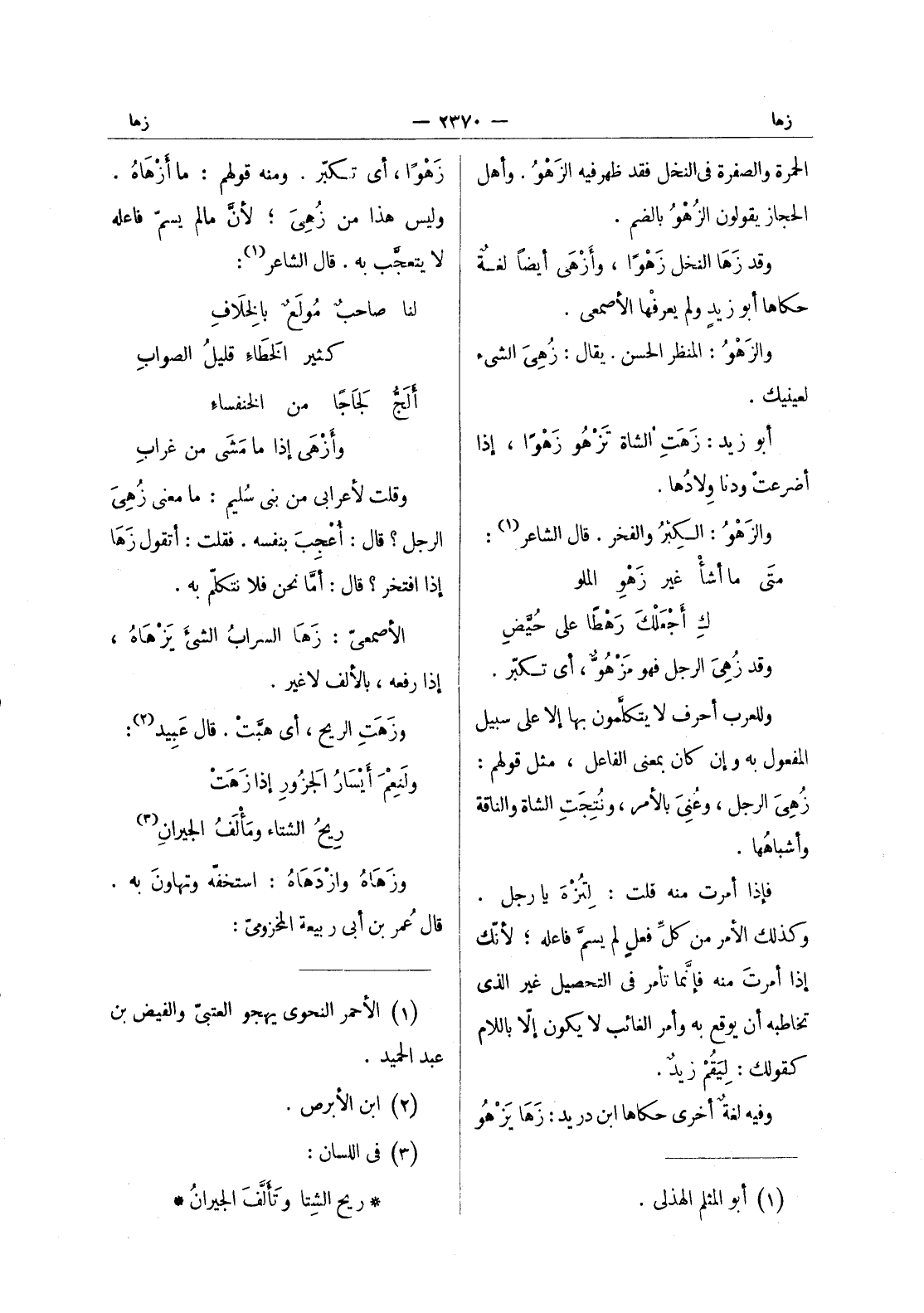 (*) زهوا، أي تكبر. ومنه قولهم: ما أَزْهاهُ. وليس هذا من زُهِيَ ; لأنَّ ما لم يسمّ فاعله لا يتعجَّب به. قال الشاعر (¬1) : لنا صاحبٌ مولَعٌ بالخِلافِ * كثير الخَطاءِ قليلُ الصوابِ أَلَجُّ لَجاجاً من الخنفساءِ * وأَزْهى إذا ما مَشى من غرابِ وقلتُ لأعرابيّ من بني سُلَيم: ما معنى زهى الرجل؟ قال: أعجب بنفسه. فقلت: أتقول زها إذا افتخر؟ قال: أما نحن فلا نتكلم به. الاصمعي: زها السراب الشئ يزهاه، إذا رفعه، بالألف لا غير. وزَهَتِ الريح، أي هبِّتْ. قال عَبيدُ (¬2) : ولَنِعْمَ أَيْسارُ الجَزورِ إذا زَهَتْ * ريحُ الشتاء ومَأْلَفُ الجيرانِ (¬3) وزَهَاهُ وازْدَهاهُ: استخفّه وتهاونَ به. قال عُمر بن أبي ربيعة المخزومى