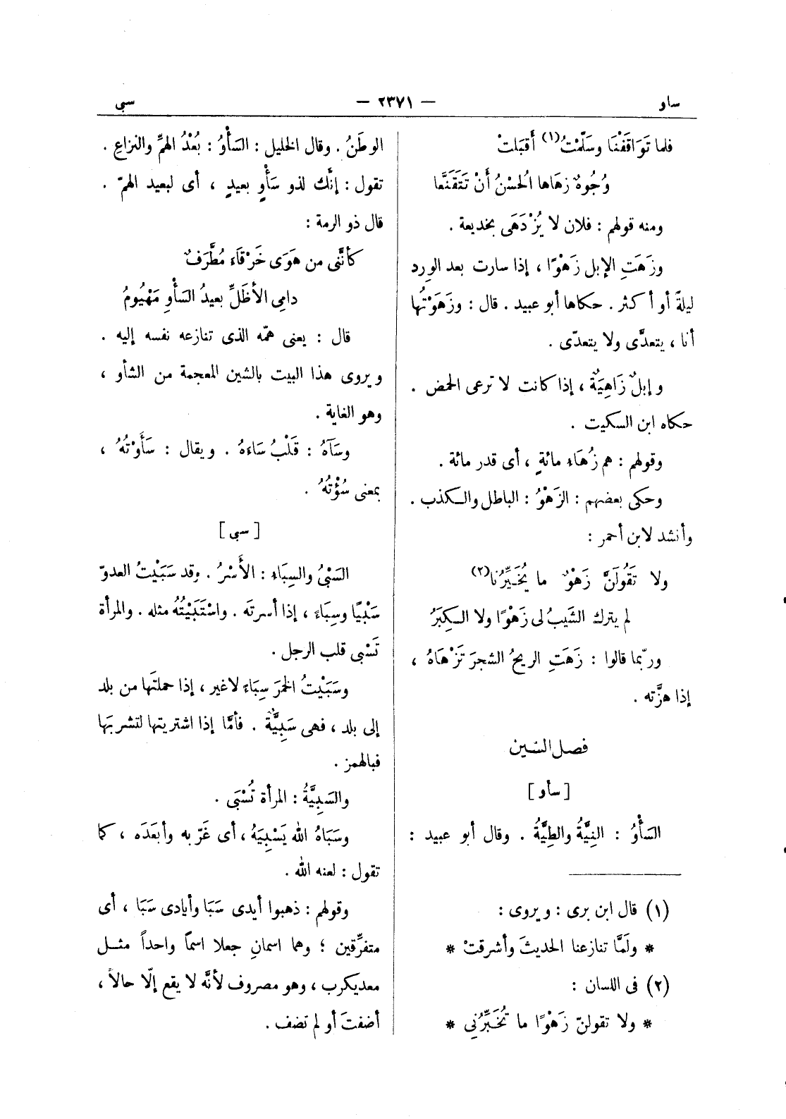 (*) الوطن. وقال الخليل: السَأْوُ: بُعْدُ الهمِّ والنزاعِ. تقول: إنَّك لذو سَأْوٍ بعيدٍ، أي لبعيد الهمّ. قال ذو الرمة: كأنَّني من هَوى خَرْقاَء مُطَّرَفٌ * دامي الأظَلَّ بعيدُ السَأْوِ مَهْيومُ قال: يعني همّه الذي تنازعه نفسه إليه. ويروى هذا البيت بالشين المعجمة من الشأو، وهو الغاية. وسآه: قلب ساءه. ويقال: سأوته، بمعنى سؤته.