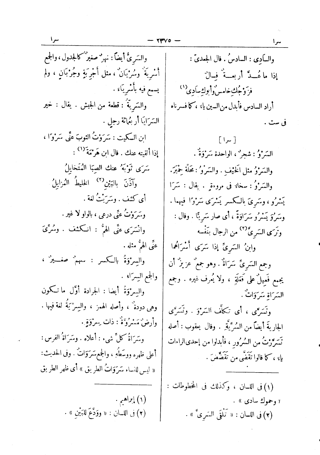 [سرا] السرو: شجر، الواحدة سروة. والسرو مثل الخيف. والسرو: محلة حمير. والسرو: سخاء في مروءةٍ. يقال: سَرا يَسْرو، وسَرْيَ بالكسر يَسْرى سَرْواً فيهما. وسرو يسرو سراوة، أي صار سَرِيَّاً. وقال: وتَرى السَرِيَّ (¬2) من الرجال بنَفْسه * وابنُ السَرِيِّ إذا سَرى أَسْراهُما وجمع السَرِيِّ سراة. وهو جمع عزيز أن يجمع فعيل على فعلة، ولا يعرف غيره. وجمع السراة سروات. وتسرى، أي تكلف السرو. وتَسَرَّى الجاريةَ أيضاً من السُرِّيَّةِ. وقال يعقوب: أصله تسررت من السرور، فأبدلوا من إحدى الراءات ياء، كما قالوا تقضى من تقضض.