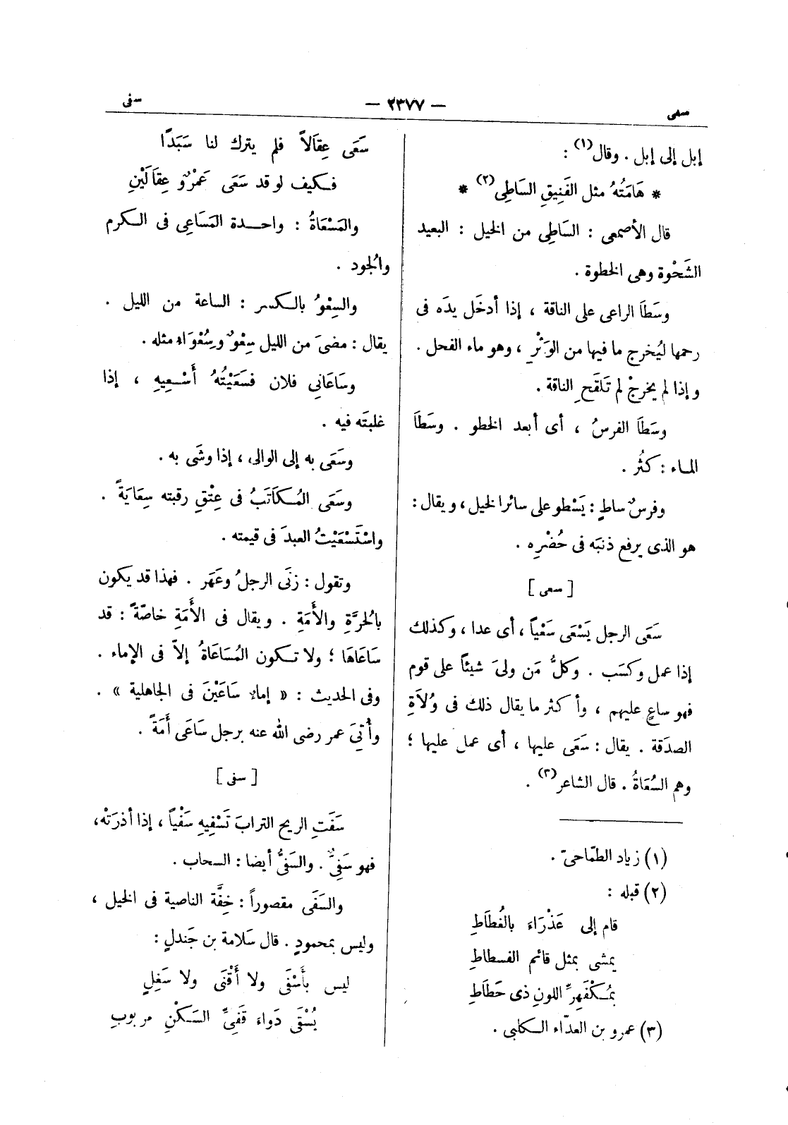 (*) سعى عقالا فلم يترك لنا سَبَداً * فكيف لو قد سعى عمرو عقالين والمَسْعاةُ: واحدة المَساعي في الكرم والجود. والسعو بالكسر: الساعة من الليل. يقال: مضَى من الليل سعو وسعواء مثله. وساعانى فلان فسعيته أسعيه، إذا غلبتَه فيه. وسعى به إلى الوالي، إذا وشى به. وسعى المُكاتَبُ في عِتْقِ رقبته سِعايَةً. واسْتَسْعَيْتُ العبْد في قيمته. وتقول: زنى الرجلُ وعَهَر. فهذا قد يكون بالحرة والامة. ويقال في الامة خاصة: قد ساعاها ; ولا تكون المُساعاةُ إلاّ في الإماء. وفي الحديث: " إماء ساعين في الجاهلية ". وأتى عمر رضى الله عنه برجل ساعى أمة.