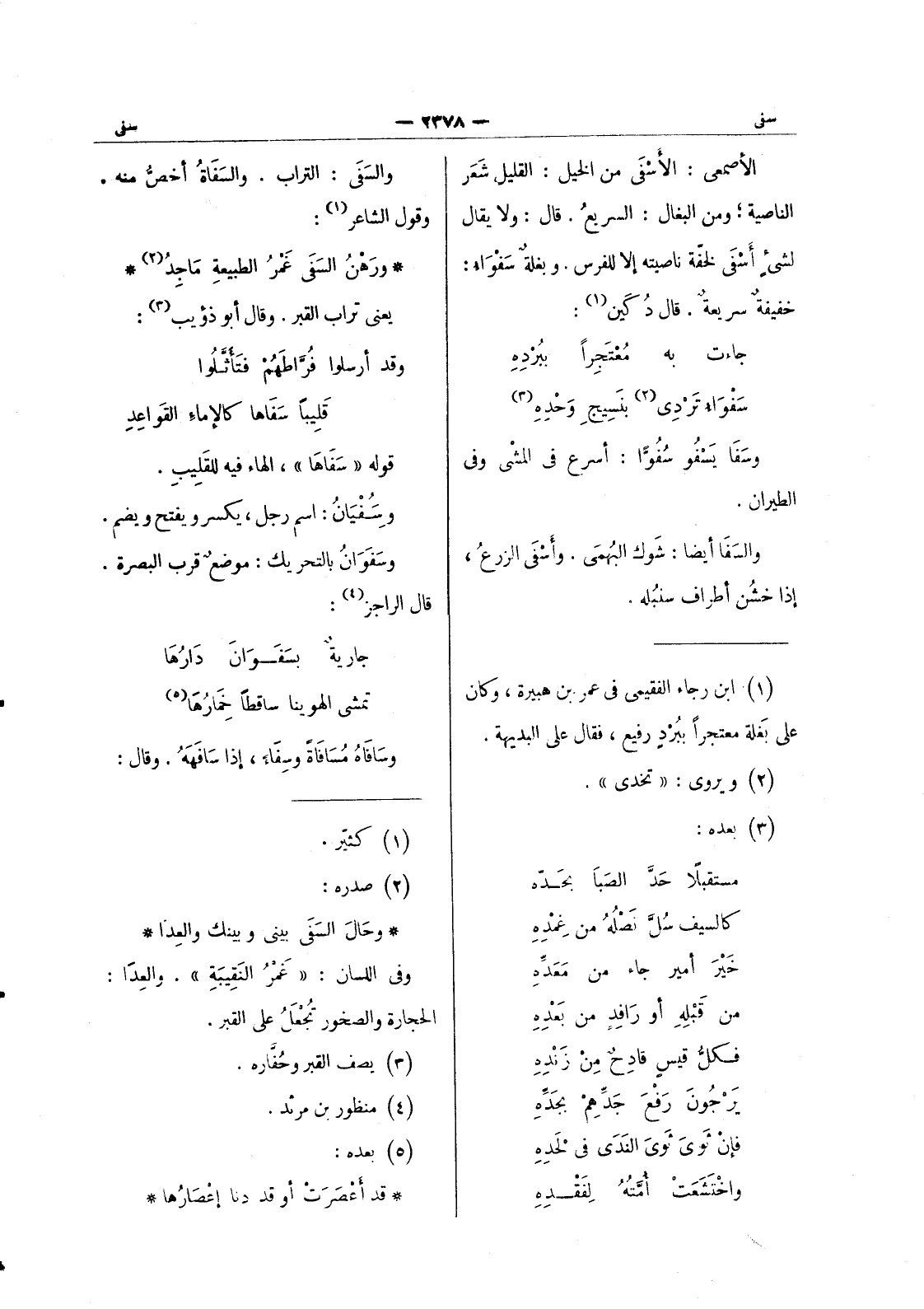 الأصمعي: الأسْفَى من الخيل: القليل شَعَر الناصية ; ومن البغال: السريعُ. قال: ولا يقال لشئ أسفى لخفة ناصيته إلا للفرس. وبغلة سفواء: خفيفه سريعة. قال دكين (¬1) : جاءت به معتجرا ببرده * سفواء تردى (¬2) بنسيج وحده (¬3) وسفا يسفو سفوا: أسرع في المشْي وفي الطيران. والسَفا أيضاً: شَوك البُهمى. وأَسْفى الزرعُ، إذا خشن أطراف سنبله.
