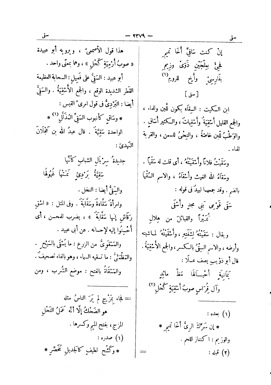 [سقى] ابن السكيت: السِقاءُ يكون للبن وللماء، والجمع القليل أسقيتة وأُسْقِياتٌ والكثير أَساقٍ. والوَطْبُ للّبن خاصّةً، والنِحْيُ للسمن، والقربة للماء. وسَقَيْتُ فلاناً وأَسْقَيْتُهُ، أي قلت له سَقْياً. وسَقاهُ الله الغيث وأَسْقاهُ، والاسم السُقْيا بالضم. وقد جمعهما لبيدٌ في قوله: سَقى قَوْمي بَني مجدٍ وأُسْقى * نُميراً والقبائلَ من هِلالِ ويقال: سَقَيْتُهُ لِشَفَتِهِ، وأَسْقَيْتُهُ لماشيته وأرضه، والاسم السقى بالكسر، والجمع الاسقية. قال أبو ذؤيب يصف عسلا: يمانية أحيالها مظ مائد * وآل قراس صوب أسقية كحل (¬2)