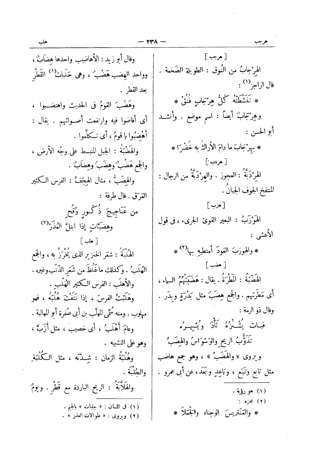 وقال أبو زيد: الأهاضيب واحدها هضابٌ، وواحد الهِضب هَضْبٌ، وهي حَلَبات (¬1) القَطرِ بعد القطر. وهَضَبَ القومُ في الحديث واهتضبوا، أي أفاضوا فيه وارتفعت أصواتهم. يقال: أهْضِبوا يا قومُ، أي تكلَّموا. والهَضْبَةُ: الجبل المنبسط على وجه الأرض، والجمع هَضْبٌ وهِضَبٌ وهِضابٌ. والهضب، مثال الهجف: الفرس الكثير العرق. قال طرفة. من عناجيج ذكور وقح * وهضبات إذا ابتل العذر (¬2)