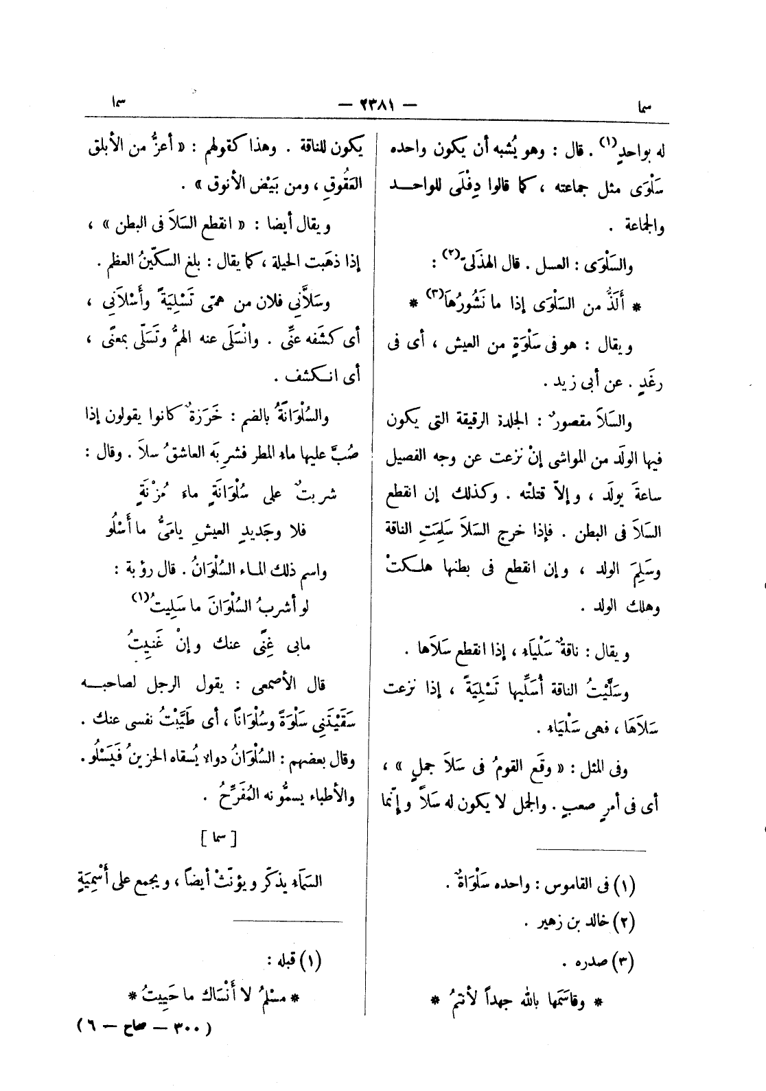 (*) يكون للناقة. وهذا كقولهم: " أعز من الابلق العقوق، ومن بيض الانوق ". ويقال أيضاً: " انقطع السَلا في البطن "، إذا ذهَبت الحيلة، كما يقال: بلغ السكين العظم. وسلانى فلان من همّي تَسْلِيَةً وأَسْلاني، أي كشَفه عنِّي. وانْسَلى عنه الهمُّ وتَسَلّى بمعنىً، أي انكشف. والسُلْوانَةُ بالضم: خَرَزةٌ كانوا يقولون إذا صب عليها ماء المطر فشر به العاشقُ سلا. وقال: شربت على سُلْوانَةٍ ماَء مُزْنَةٍ * فلا وجَديدِ العيش يامى ما أسلو واسم ذلك الماء السُلْوانُ. قال رؤبة: لو أشربُ السُلْوانَ ما سَليتُ (¬1) * ما بي غِنىً عنك وإنْ غَنِيتُ قال الأصمعي: يقول الرجل لصاحبه سَقَيْتَني سَلْوَةً وسُلْواناً، أي طَيَّبْتَ نفسي عنك. وقال بعضهم: السُلْوانُ دواءٌ يُسقاه الحزينُ فيسلو. والاطباء يسمونه المفرح.