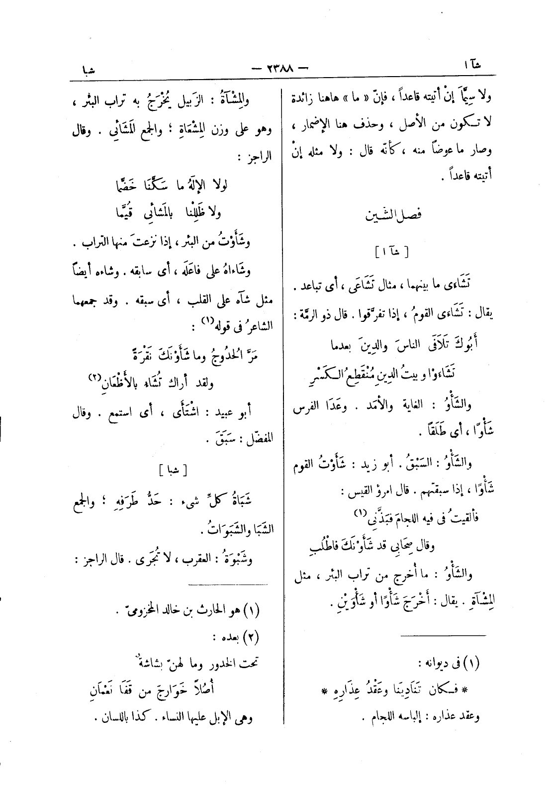 (*) والمشآة: الزبيل يخرَجُ به تراب البئر، وهو على وزن المشعاة، والجمع المشائى. وقال الراجز: لولا الاله ما سكنا خضما * ولا ظللنا بالمشائى قيما وشأوت من البئر، إذا نزعتَ منها التراب. وشاءاهُ على فاعَلَه، أي سابقه. وشاءه أيضاً مثل شآه على القلب، أي سبقه. وقد جمعهما الشاعرُ في قوله (¬1) : مَرَّ الحُدوجُ وما شَأَوْنَكَ نَقْرَةً * ولقد أراك تُشاءُ بالأَظْعانِ (¬2) أبو عبيد: اشْتَأى، أي استمع. وقال المفضل: سبق.