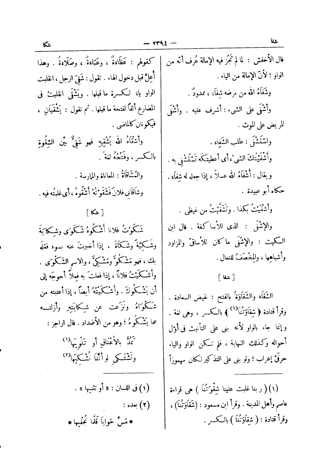 [شقا] الشَقاءُ والشَقاوَةُ بالفتح: نقيض السعادة. وقرأ قتادة (شقاوتنا (¬1)) بالكسر، وهى لغة. وإنما جاء بالواو لانه بنى على التأنيث في أول أحواله وكذلك النهاية، فلم تكن الواو والياء حرفي إعراب، ولو بنى على التذكير لكان مهموزا