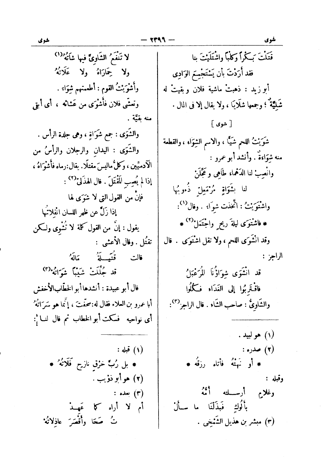 (*) . لا تنفع الشاوى شاته (¬1) * ولا حماراه ولا علاته وأشويت القوم: أطعمتهم شواء. وتعشى فلان فأشوى عشائه، أي أبقى منه بقيَّة. والشَوى: جمع شَواةٍ، وهي جلدة الرأس. والشَوى: اليدانِ والرجلانِ والرأسُ من الآدميِّين، وكلُّ ما ليسَ مقتلاً. يقال: رماه فأَشْواهُ، إذا لم يُصِبِ المَقْتَلَ. قال الهذَليّ (¬2) : فإنَّ من القول التي لا شَوى لها * إذا زَلَّ عن ظهر اللسان انْفِلاتُها يقول: إنَّ من القول كلمة لا تُشْوي ولكن تقتل. وقال الاعشى: قالت قتيلة ماله * قد جللت شيبا شواته (¬3) قال أبو عبيدة: أنشدها أبو الخطاب الاخفش أبا عمرو بن العلاء فقال له: صحفت، إنما هو سراته أي نواحيه فسكت أبو الخطاب ثم قال لنا