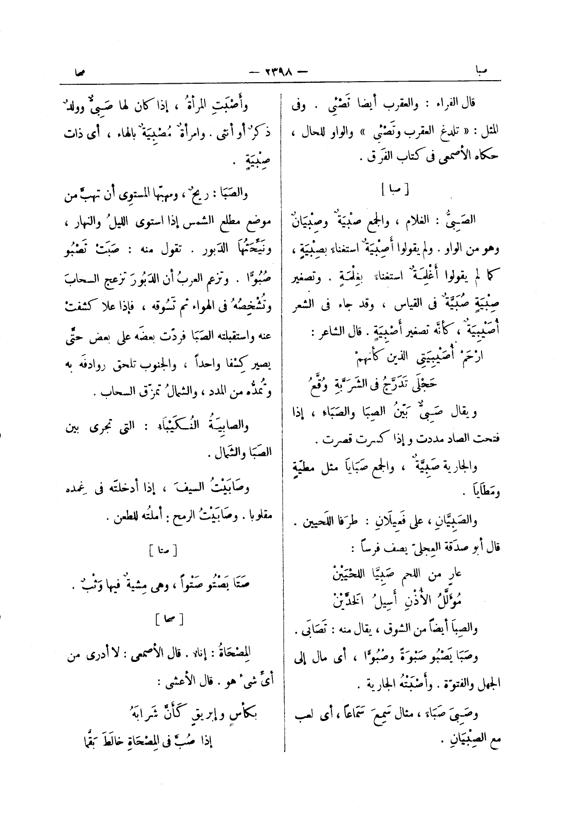 [صبا] الصبى: الغلام، والجمع صبية وصبيان وهو من الواو. ولم يقولوا أصبية استغناء بصبية، كما لم يقولوا أغلمة استغناء بغلمة. وتصغير صبية صبية في القياس، وقد جاء في الشعر أُصَيْبيَةٌ، كأنَّه تصغير أَصْبيَةٍ. قال الشاعر: ارْحَمْ أُصَيْبِيَتي الذين كأنهمْ * حَجْلى تَدَرَّجُ في الشَرَبَّةِ وُقَّعُ ويقال صَبِيٌّ بَيِّنُ الصِبا والصَباءِ، إذا فتحت الصاد مددت وإذا كسرت قصرت. والجارية صبية، والجمع صبايا مثل مطية ومطايا. والصبيان، على فعيلان: طرفا اللحيين. قال أبو صدقة العجلى يصف فرسا: عار من اللحم صبيا اللحيين * مؤلل الاذن أسيل الخدين والصبا أيضا من الشوق، يقال منه: تَصابى. وصَبا يصبو صبوة وصبوا، أي مال إلى الجهل والفتوّة. وأَصْبَتْهُ الجارية. وصبى صباء، مثال سمع سماعا، أي لعب مع الصبيان.