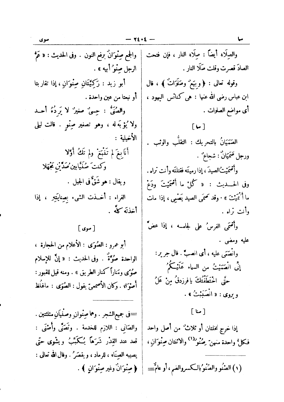 (*) والجمع صِنْوانٌ برفع النون. وفي الحديث: " عَمُّ الرجل صِنْوُ أبيه ". أبو زيد: ركيتان صنوان، إذا تقاربتا أو نبعتا من عين واحدة. والصُنَيُّ: حِسيٌ صغيرٌ لا يَرِدُهُ أحد ولا يُؤبَه له، وهو تصغير صنو. قالت ليلى الاخيلية: أنابغ لم تنبغ ولم تك أولا * وكنت صنيا بين صدين مجهلا ويقال: هو شق في الجبل. الفراء: أخذت الشئ بصنايته، إذا أخذته كله.