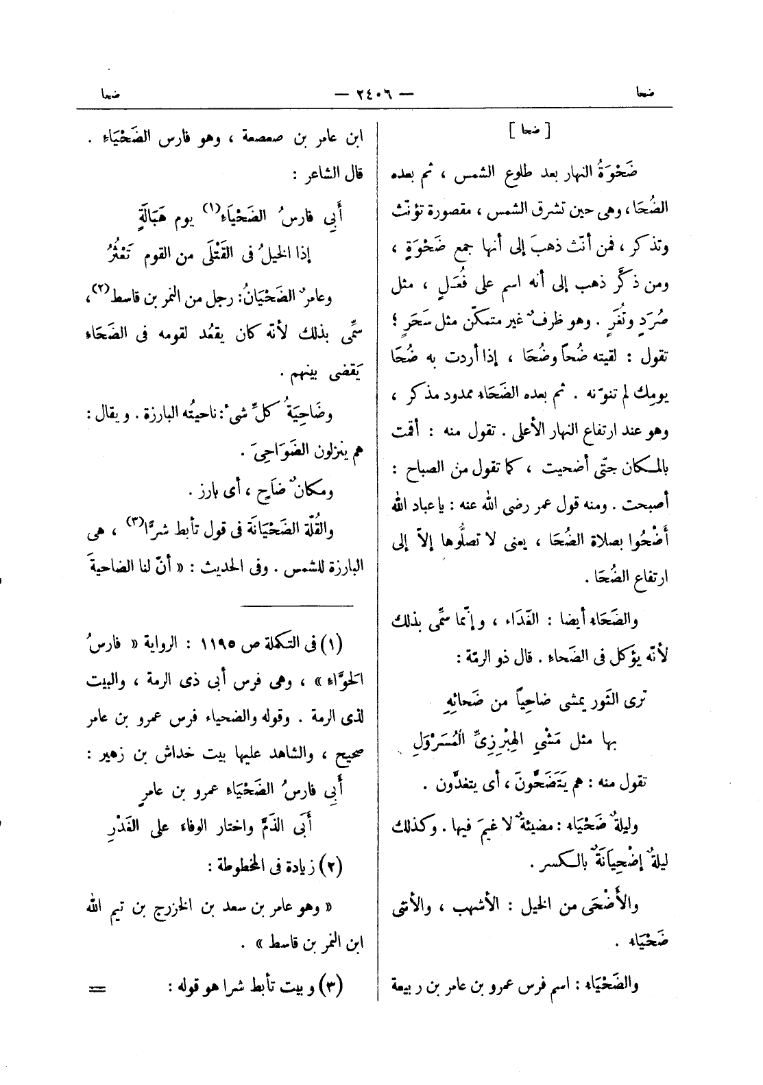 (¬1) في التكملة ص 1195: الرواية: " فارس الحواء "، وهى فرس أبى ذى الرمة، والبيت لذى الرمة. وقوله والضحياء فرس عمرو بن عامر صحيح، والشاهد عليها بيت خداش بن زهير: أبى فارس الضحياء عمرو بن عامر * أبى الذم واختار الوفاء على الغدر