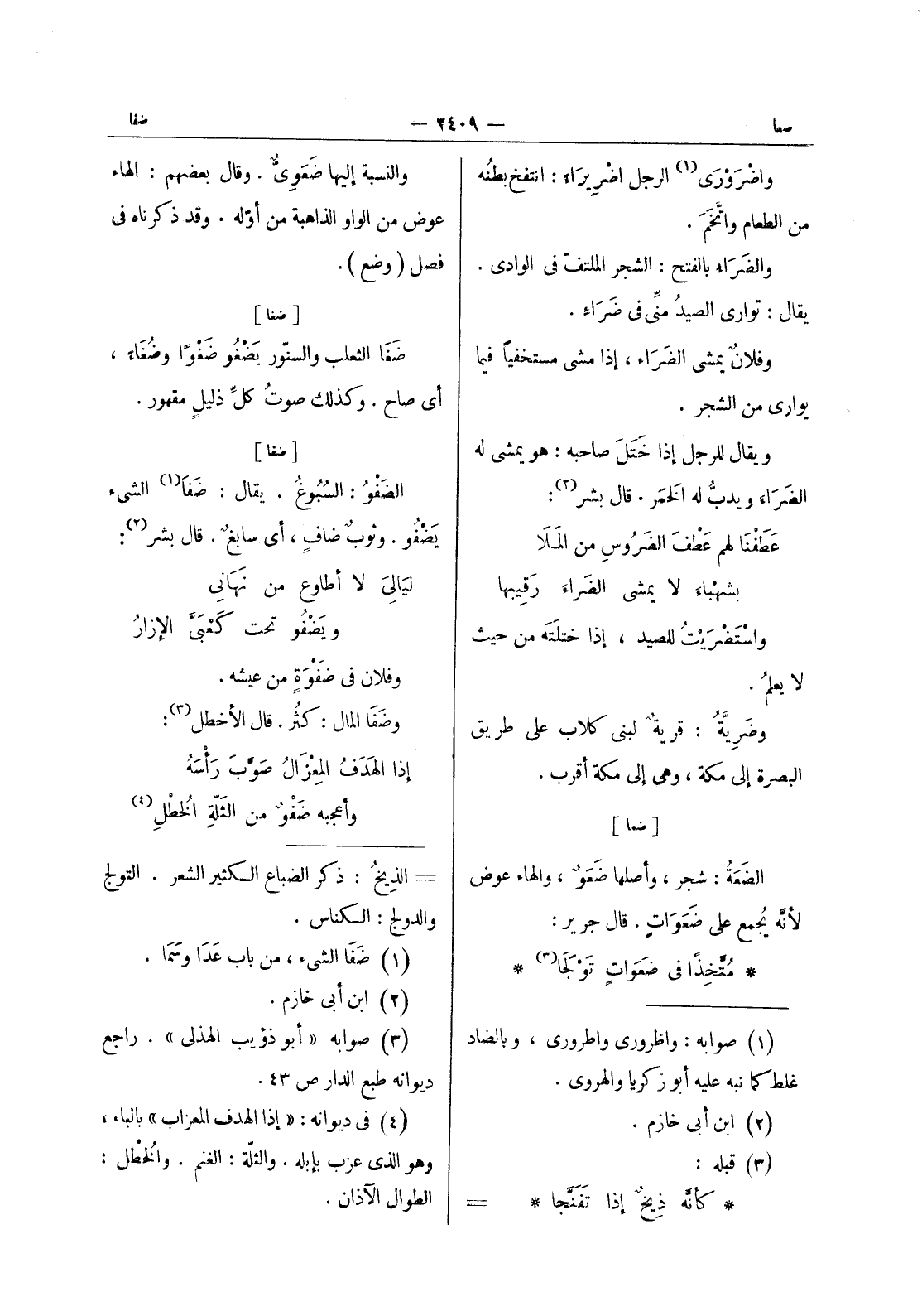 [ضفا] الضَفْوُ: السُبوغُ. يقال: ضَفا (¬1) الشئ يضفو. وثوب ضاف، أي سابغٌ. قال بشر (¬2) : لياليَ لا أطاوع من نَهاني * ويَضْفو تحت كَعْبَيَّ الإزارُ وفلان في ضَفْوَةٍ من عيشه. * وضَفا المال: كثُر. قال الاخطل (¬3) : إذا الهَدَفُ المِعْزالُ صَوَّبَ رَأْسَهُ * وأعجبه ضفو من الثلة الخطل (¬4) =