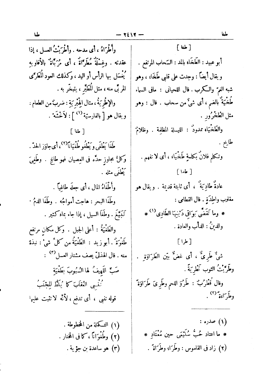 وأطراه، أي مدحه. وأَطْرَيْتُ العسل، إذا عقدته. وغِسْلَةٌ مُطَرَّاةٌ، أي مُرَبَّاةٌ بالأفاويهِ يُغسل بها الرأس أو اليد، وكذلك العود المُطَرَّى المربَّى منه، مثل المُطَيَّرِ، يتبخَّر به. والاطرية، مثال الهبرية: ضرب من الطعام: ويقال هو [بالفارسية (¬1) ] : لاخشه.