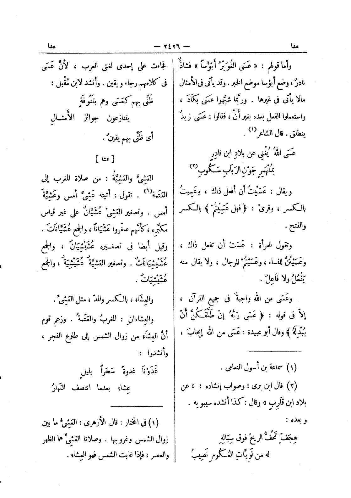 (¬1) في المختار: قال الازهرى: العشى ما بين زوال الشمس وغروبها. وصلاتا العشى هما الظهر والعصر، فإذا غابت الشمس فهو العشاء.