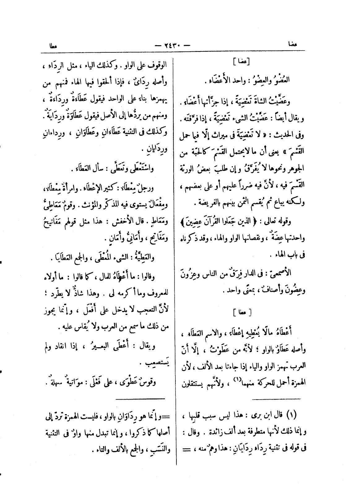 (*) الوقوف على الواو. وكذلك الياء، مثل الرداء، وأصله رداى، فإذا ألحقوا فيها الهاء فمنهم من يهمزها بناء على الواحد فيقول عطاءة ورداءة، ومنهم من يردها إلى الاصل فيقول عطاوة ورداية. وكذلك في التثنية عطاءان وعطاوان، ورداءان وردايان. واستعطى وتعطى: سأل العَطاءَ. ورجلٌ مِعْطاءٌ: كثير الإعطاء. وامرأةٌ مِعْطاءٌ، ومِفْعالٌ يستوي فيه المذكر والمؤنث. وقومٌ معاطِيٌّ ومعاط. قال الاخفش: هذا مثل قولهم مفاتيح ومفاتح، وأمانى وأمان. والعطية: الشئ المعطى، والجمع العطايا. وقالوا: ما أعطاهُ للمال، كما قالوا: ما أولاه للمعروف وما أكرمه لي. وهذا شاذٌّ لا يطرد ; لان التعجب لا يدخل على أفعل، وإنما يجوز من ذلك ما سمع من العرب ولا يقاس عليه. ويقال: أعطى البعير، إذا انقاد ولم يسْتعصِب. وقوسٌ عطوى، على فعلى: مواتية سهلة.
