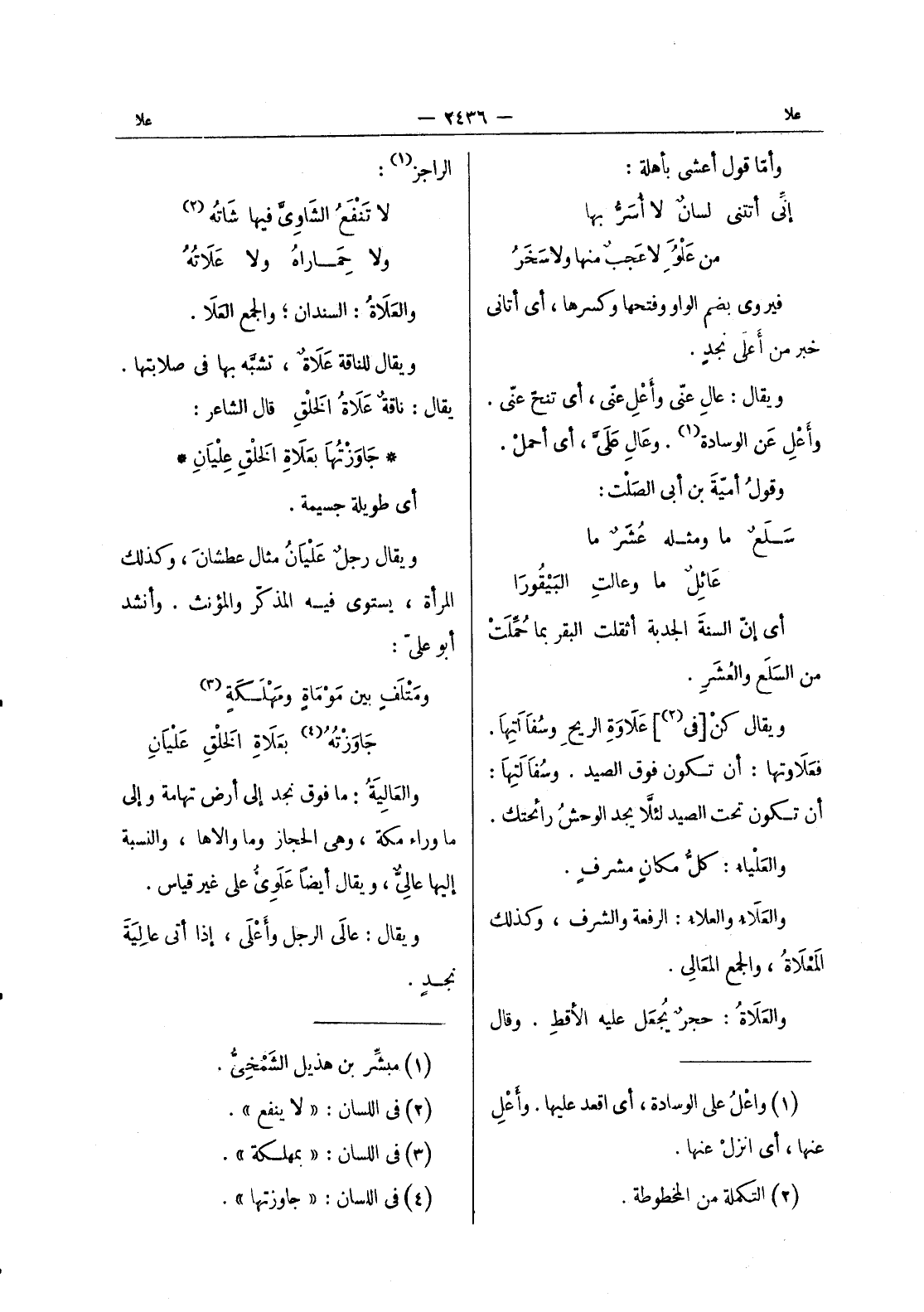 وأما قول أعشى باهِلَةَ: إنّي أَتَتْني لِسانٌ لاأسر بها * من عَلْوَ لا عَجَبٌ منها ولا سخر فيروى بضم الواو وفتحها وكسرها، أي أتانى خبر من أعلى نجد. ويقال: عال عنى، وأعل عنِّي، أي تنحّ عنّي. وأعْلِ عن الوسادة (¬1) . وعَالِ عليَّ، أي أحمل. وقول أمية بن أبى الصلت: سلع ما ومثله عشر ما * عائل ما وعالت البيقورا أي إن السنة الجدبة أثقلت البقر بما حملت من السلع والعشر. ويقال كن [في (¬2) ] علاوة الريح وسُفالَتِها. فعَلاوتها: أن تكون فوق الصيد. وسُفالَتِها: أن تكون تحت الصيد لئلا يجد الوحشُ رائحتك. والعَلياءُ: كلُّ مكانٍ مشرفٍ. والعَلاءُ والعلاءُ: الرفعة والشرف، وكذلك المَعْلاةُ، والجمع المعالي. والعَلاةُ: حجرٌ يجعل عليه الاقط. وقال
