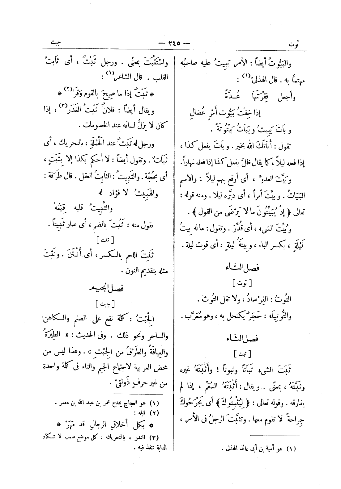 والبيوت أيضا: الامر يبيت عليه صاحبه مهتما به. قال الهذلى (¬1) : وأجعل فقرتها عدة * إذا خفت بيوت أمر عضال وبات يَبيتُ ويَباتُ بَيْتوتَةً. تقول: أَباتَكَ الله بخير. وباتَ يفعل كذا، إذا فعله ليلاً، كما يقال ظلَّ يفعل كذا إذا فعله نهاراً. وبَيَّتَ العدوَّ، أي أوقع بهم ليلاً. والاسم البَياتُ. وبيَّتَ أمراً، أي دبَّره ليلاً. ومنه قوله: تعالى (إِذْ يُبَيِّتُونَ ما لا يَرْضى من القول) . وبُيِّتَ الشئ، أي قدر. وتقول: ماله بيت ليلة، بكسر الباء، وبيتَهُ ليلةٍ، أي قوت ليلة.