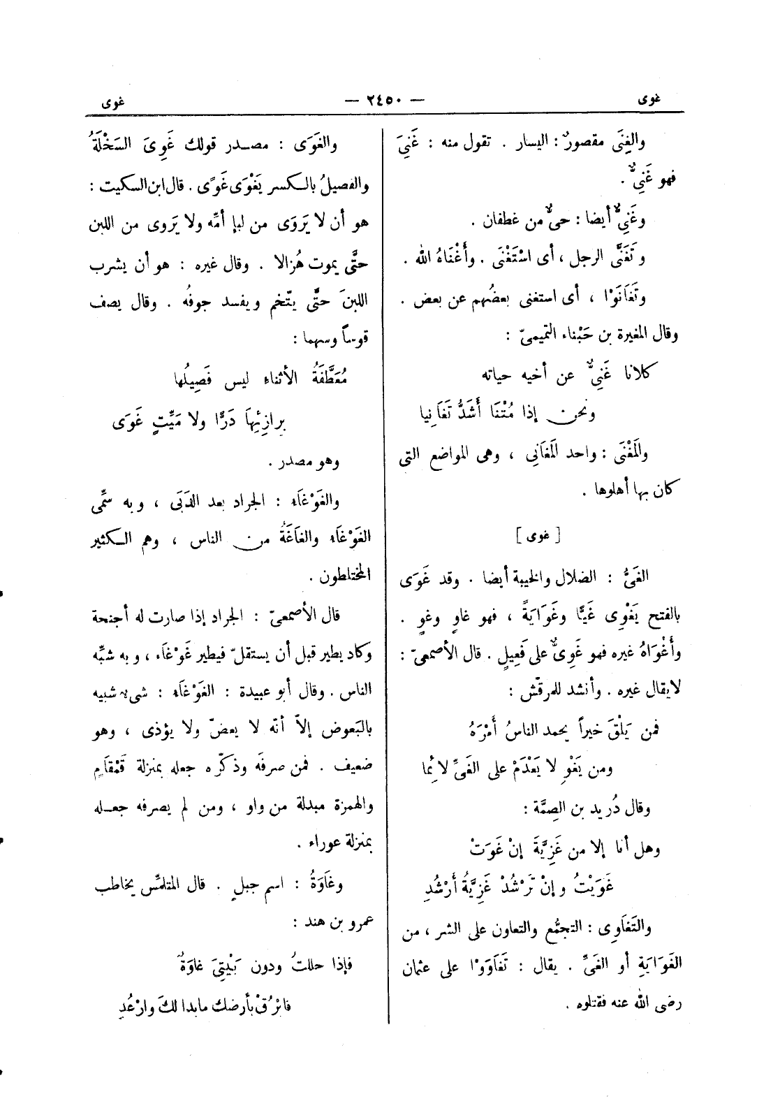 والغَوى: مصدر قولك غَوِيَ السَخْلَةُ والفصيل بالكسر يغوى غوى. قال ابن السكيت: هو أن لا يروى من لبإ أمه ولا يروى من اللبن حتى يموت هزالا. وقال غيره: هو أن يشرب اللبن حتى يتخم ويفسد جوفه. وقال يصف قوسا وسهما: معطفة الاثناء ليس فصيلها * برازئها درا ولا ميت غوى وهو مصدر. والغوغاء: الجراد بعد الدَبى، وبه سمي الغَوْغاءُ والغاغَةُ من الناس، وهم الكثير المختلطون. قال الاصمعي: الجراد إذا صارت له أجنحة وكاد يطير قبل أن يستقل فيطير غوغاء، وبه شبه الناس. وقال أبو عبيدة: الغوغاء: شئ شبيه بالبعوض إلا أنه لا يعض ولا يؤذى، وهو ضعيف. فمن صرفه وذكره جعله بمنزلة قمقام والهمزة مبدلة من واو، ومن لم يصرفه جعله بمنزلة عوراء. وغاوة: اسم جبل. قال المتلمس يخاطب عمرو بن هند: فإذا حللت ودون بيتى غاوة * فابرق بأرضك ما بدا لك وارعد