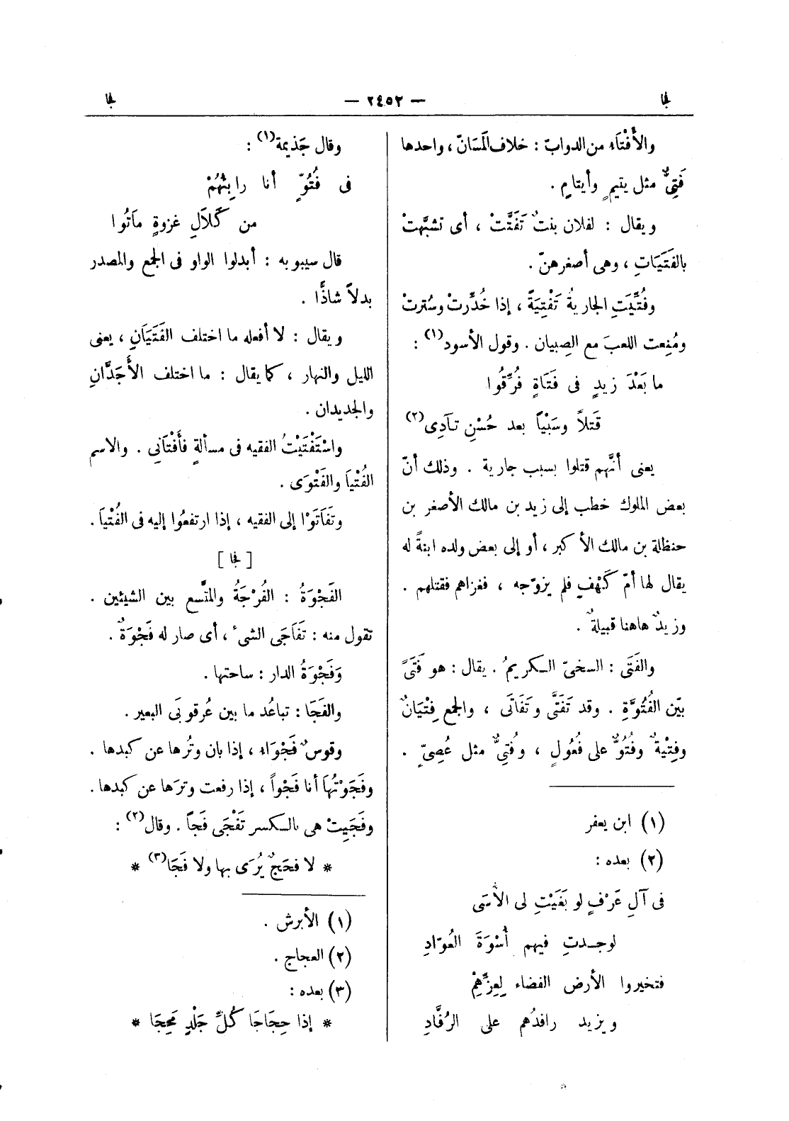 والافتاء من الدواب: خلاف المسان، واحدها فتى مثل يتيم وأيتام. ويقال: لفلان بنتٌ تَفَتَّتْ، أي تشبَّهت بالفتياتِ، وهي أصغرهنّ. وفُتِّيَت الجاريةُ تَفْتِيَةً، إذا خدِّرت وسترت ومُنعت اللعب مع الصبيان. وقول الاسود (¬1) : ما بعد زيد في فتاة فرقوا * قتلا وسبيا بعد حسن تآدى (¬2) : يعنى أنهم قتلوا بسبب جارية. وذلك أن بعض الملوك خطب إلى زيد بن مالك الاصغر بن حنظلة بن مالك الاكبر، أو إلى بعض ولده ابنة له يقال لها أم كهف فلم يزوجه، فغزاهم فقتلهم. وزيد هاهنا قبيلة. والفتى: السخى الكريمُ. يقال: هو فَتًى بيِّن الفتوّةِ. وقد تَفَتَّى وتَفاتى، والجمع فتيان وفتية وفتو على فعول، وفتى مثل عصى.