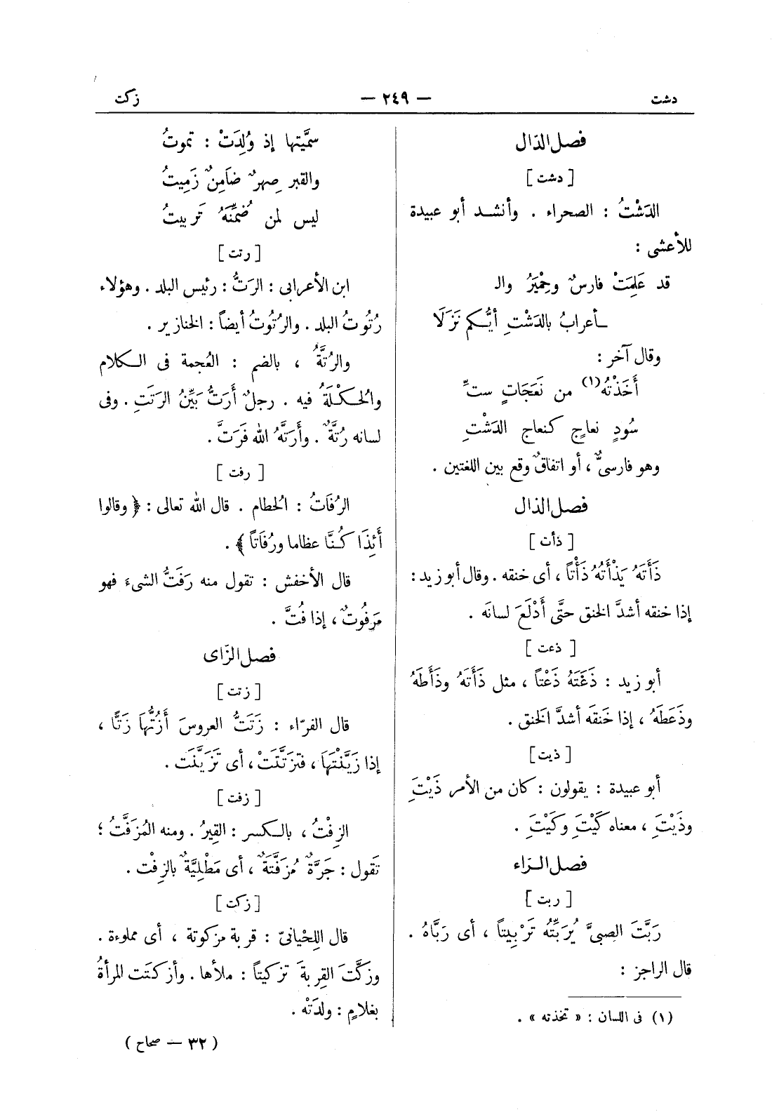 [دشت] الدشت: الصحراء. وأنشد أبو عبيدة للاعشى: قد علمت فارس وحمير وال * أعراب بالدشت أيكم نزلا وقال آخر: أخذته (¬1) من نعجات ست * سود نعاج كنعاج الدشت * وهو فارسي، أو اتفاقٌ وقع بين اللغتين.