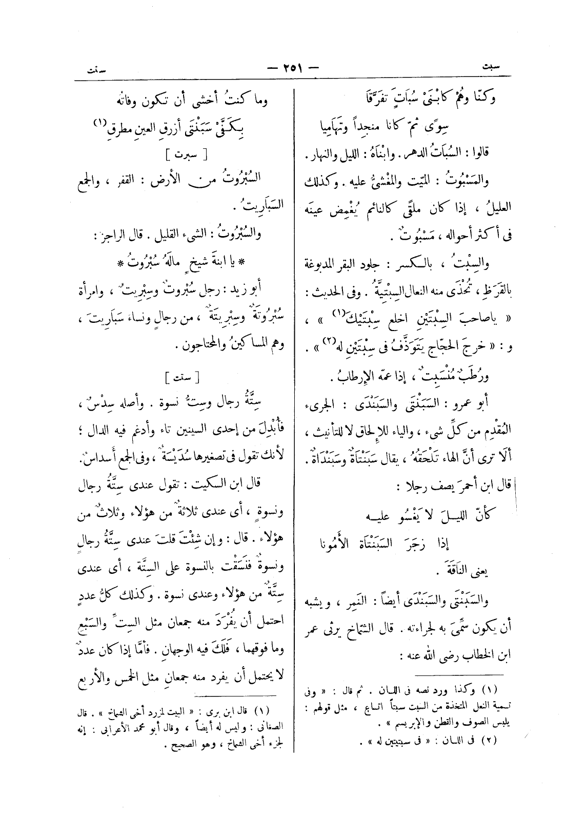 وكنا وهم كابنى سُباتٍ تَفَرَّقا * سِوىً ثمّ كانا منجِدا وتَهامِيا قالوا: السُباتُ الدهر. وابْناهُ: الليل والنهار. والمَسْبوتُ: الميّت والمغْشيُّ عليه. وكذلك العليلُ، إذا كان ملقىً كالنائم يُغْمِض عينَه في أكثر أحواله، مَسْبوتٌ. والسِبْتُ، بالكسر: جلود البقر المدبوغة بالقَرَظِ، تحذى منه النعال السبتية. وفى الحديث: " يا صاحب السبتين اخلع سبتيك (¬1) "، و: " خرج الحجاج يتوذف في سبتين له (¬2) ". ورطب مُنْسَبِتٌ، إذا عمّه الإِرْطابُ. أبو عمرو: السبنتى والسبندى: الجرئ المقدم من كل شئ، والياء للالحاق لا للتأنيث، ألا ترى أن الهاء تلحقه، يقال سبنتاة وسبنداة. قال ابن أحمر يصف رجلا: كأن الليل لا يغسو عليه * إذا زجر السبنتاة الامونا يعنى الناقة. والسبنتى والسبندى أيضاً: النَمِر، ويشبه أن يكون سمِّيَ به لجراءته. قال الشَّماخ يرثى عمر ابن الخطاب رضى الله عنه: