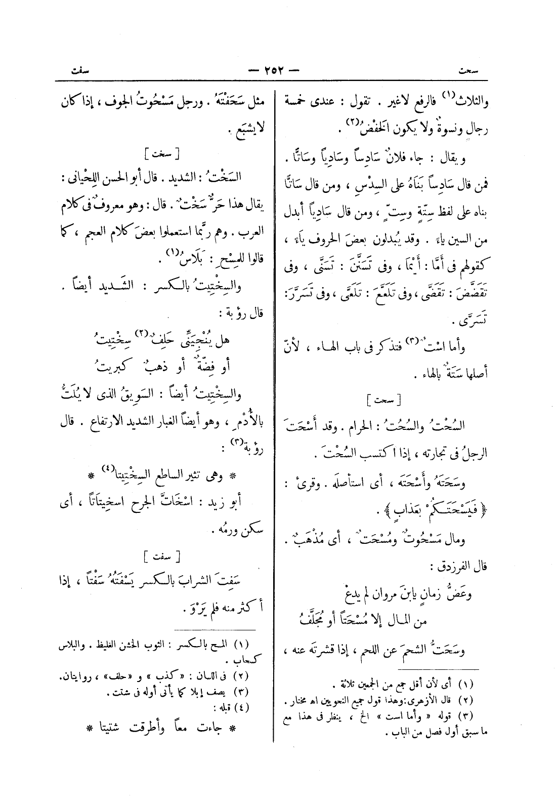 [سخت] السَخْتُ: الشديد. قال أبو الحسن اللِحْياني: يقال هذا حَرٌّ سخت. قال: وهو معروف في كلام العرب. وهم ربما استعملوا بعض كلام العجم، كما قالوا للمسح: بلاس (¬1) . والسختيت بالكسر: الشديد أيضا قال رؤبة: هل ينجيني حلف (¬2) سختيت * أو فضة أو ذهب كبريت والسختيت أيضا: السويق الذى لايلت بالادم، وهو أيضا الغبار الشديد الارتفاع. قال رؤبة (¬3) :
