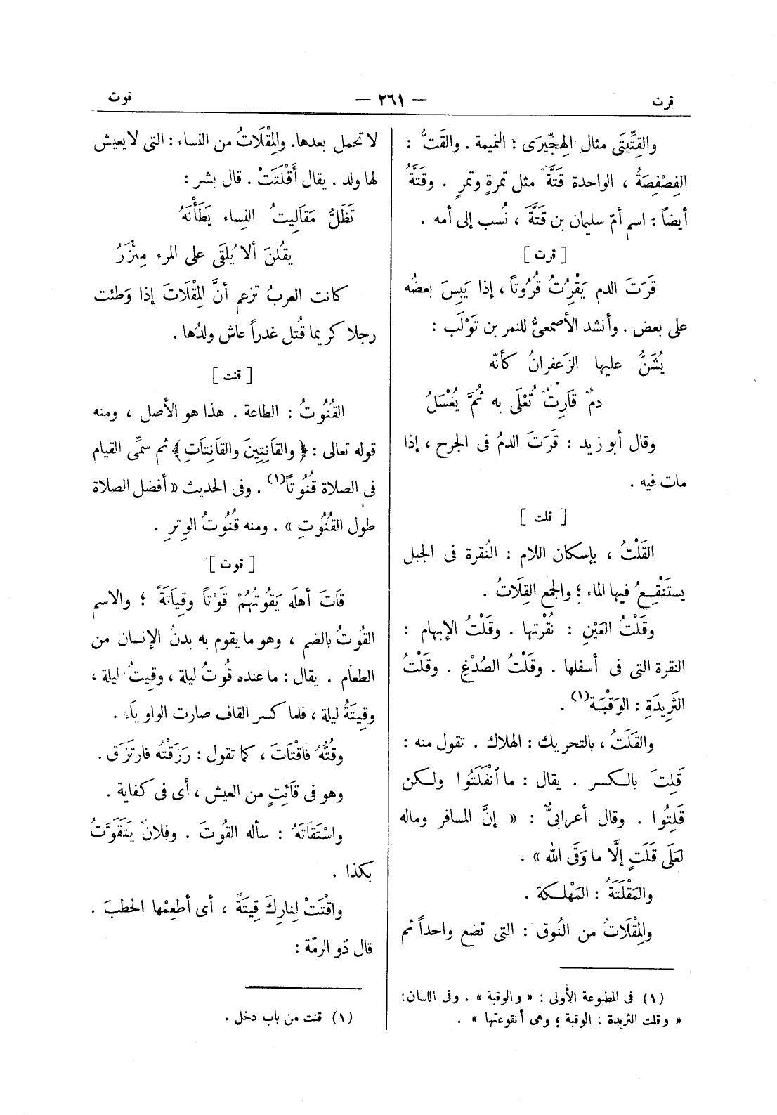 [قلت] القَلْتُ: بإسكان اللام: النُقرة في الجبل يَستَنقِعُ فيها الماء، والجمع القِلاتُ. وقَلْتُ العَيْنِ: نُقْرتها. وقَلْتُ الإبهام: النقرة التي في أسفلها. وقَلْتُ الصُدْغِ. وقَلْتُ الثَريدَةِ: الوَقْبَة (¬1) . والقَلَتُ، بالتحريك: الهلاك. تقول منه: قَلِتَ بالكسر. يقال: ما انفلتوا ولكن قلتوا. وقال أعرابي: " إنَّ المسافر وماله لعَلى قَلَتٍ إلا ما وَقى الله ". والمَقْلَتَةُ: المهلكة. والمِقْلاتُ من النوق: التي تضع واحدا ثم
