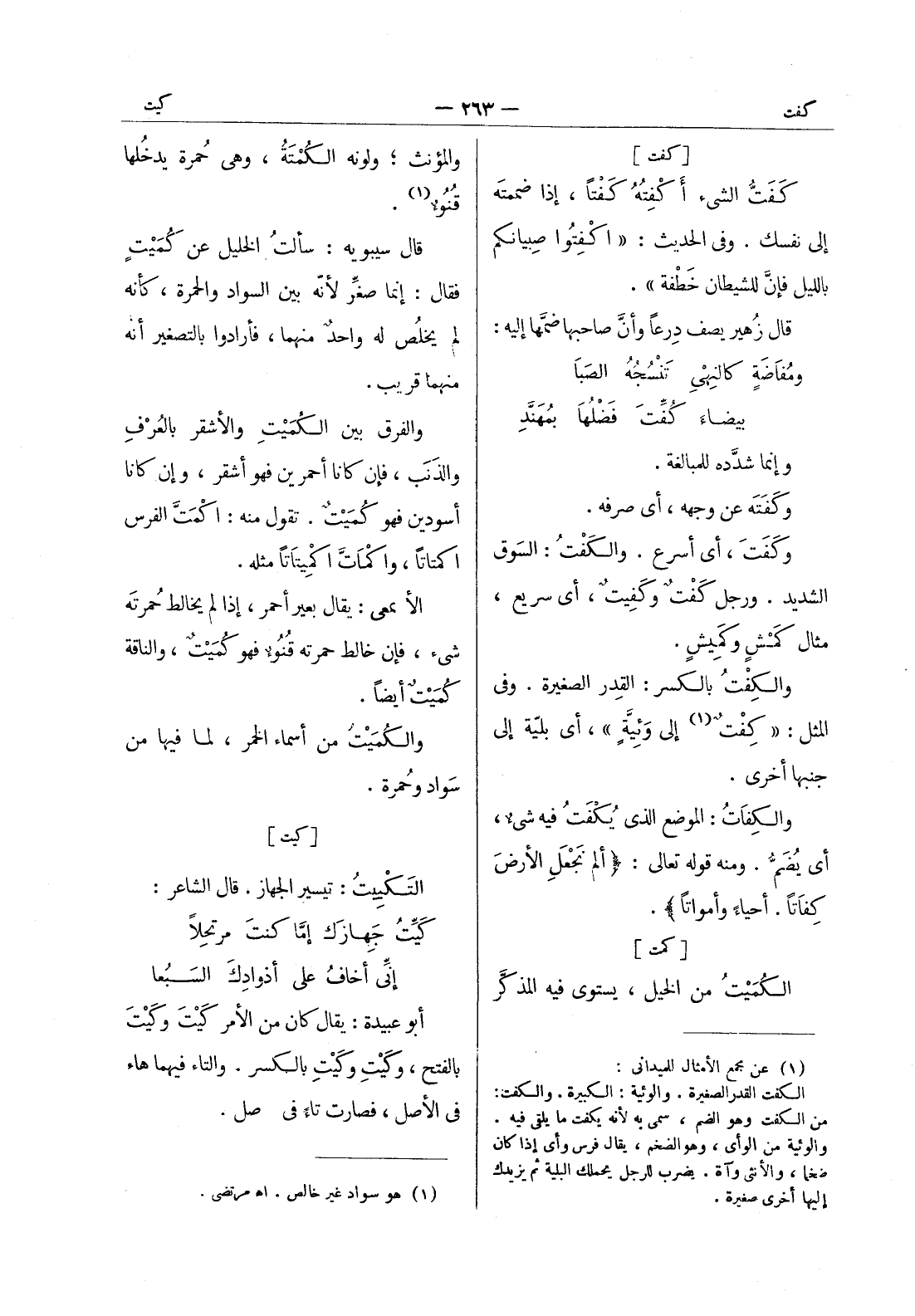 والمؤنث، ولونه الكمتة، وهى حمرة يدخلها قنوء (¬1) . قال سيبويه: سألت الخليل عن كميت فقال: إنما صغر لانه بين السواد والحمرة، كأنه لم يخلص له واحد منهما، فأرادوا بالتصغير أنه منهما قريب. والفرق بين الكُمَيْتِ والأشقر بالعُرْفِ والذَنَب، فإن كانا أحمرين فهو أشقر، وإن كانا أسودين فهو كُمَيْتٌ. تقول منه: اكمت الفرس اكمتاتا، واكْماتَّ اكْميتاتاً مثله. الأصمعيّ: يقال بعير أحمر، إذا لم يخالط حمرته شئ، فإن خالط حمرته قُنُوءٌ فهو كُمَيْتٌ، والناقة كُمَيْتٌ أيضاً. والكُمَيْتُ من أسماء الخمر، لما فيها من سَواد وحُمرة.