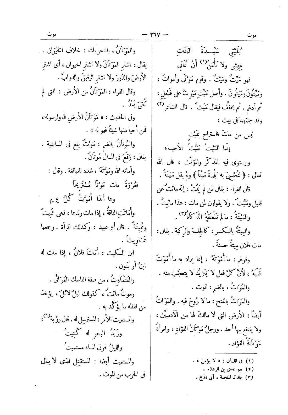 والموتان، بالتحريك: خلاف الحيَوان. يقال: اشترِ المَوَتانَ ولا تشترِ الحيوان، أي اشترِ الأرضَ والدُورَ ولا تشترِ الرقيقَ والدوابَّ. وقال الفراء: المَوَتانُ من الأرض: التي لم تُحْيَ بعد. وفي الحديث: " مَوَتانُ الأرضِ لله ولرسوله، فمن أحيا منها شيئاً فهو له ". والمُوتانُ بالضم: موتٌ يقع في الماشية. يقال: وَقَعَ في المال موتانٌ. وأماتَه الله ومَوَّتَهُ، شدِّد للمبالغة. وقال: فعُرْوَةُ ماتَ مَوْتاً مُسْتَريحاً وها أنذا أُمَوَّتُ كُلَّ يومِ وأَماتَتِ الناقةُ، إذا مات ولدها، فهي مُميتٌ ومُميتَةٌ. قال أبو عبيد: وكذلك المرأة. وجمعها مَماويتُ. ابن السكيت: أَماتَ فلانٌ، إذا مات له ابنٌ أو بَنون. والمُتَماوِتُ، من صفة الناسك المُرائي. وموتٌ مائتٌ، كقولك ليلٌ لائلٌ، يؤخذ من لفظه ما يؤكَّد به. والمستميت للأمر: المسترسِل له. قال رؤبة (1) : وزَبَدُ البحرِ له كَتيتُ * والليلُ فوقَ الماءِ مستميتُ والمستميت أيضاً: المستقتِل الذي لا يبالي في الحرب من الموت.
