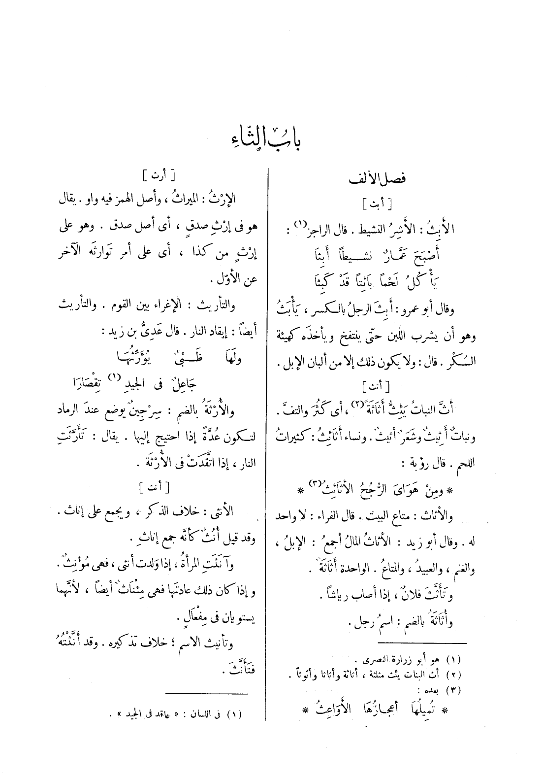 [أثث] أَثَّ النباتُ يَئِثُّ أثاثه (¬2) ، أي كَثرَ والتفَّ. ونبات أَثيثٌ وشَعَرٌ أثيثٌ. ونساء أَثائِثُ: كثيراتُ اللحم. قال رؤبة: