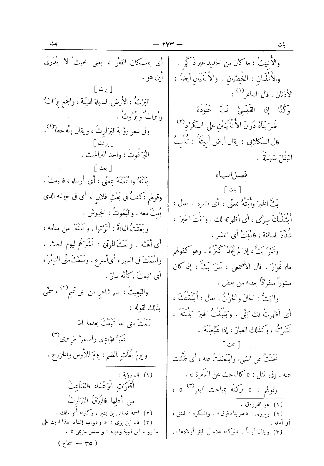 [بحث] بحثت عن الشئ وابتحثت عنه، أي فتَّشت عنه. وفي المثل: " كالباحث عن الشَفرة ". وقولهم: " تركته بمباحث البقر (¬3) "،