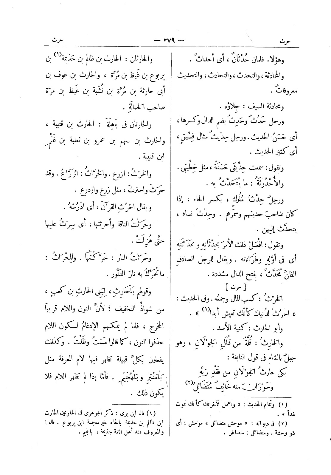 [حرث] الحَرْثُ: كسب المال وجمعُه. وفي الحديث: " احْرُثُ لدُنياك كأنّك تعيش أبداً (¬1) ". وأبو الحارث: كنية الاسد. والحارث: قلة من قلل الجولان، وهو جبل بالشام في قول النابغة. بكى حارث الجولان من فقد ربه * وحوران منه خائف متضائل (¬2)