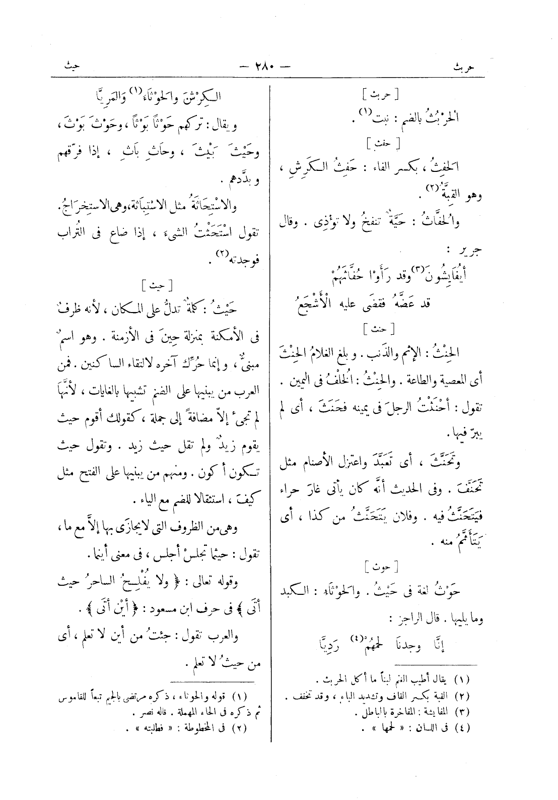 الكرش والحوثاء (¬1) والمريا ويقال: تركهم حَوْثاً بَوْثاً، وحَوْثَ بَوْثَ، وحَيْثَ بَيْثَ، وحاثِ باثِ، إذا فرّقهم وبدَّدهم. والاسْتِحاثَةُ مثل الاسْتِباثة، وهى الاستخراج. تقول استحثت الشئ، إذا ضاع في التراب فوجدته (¬2) .