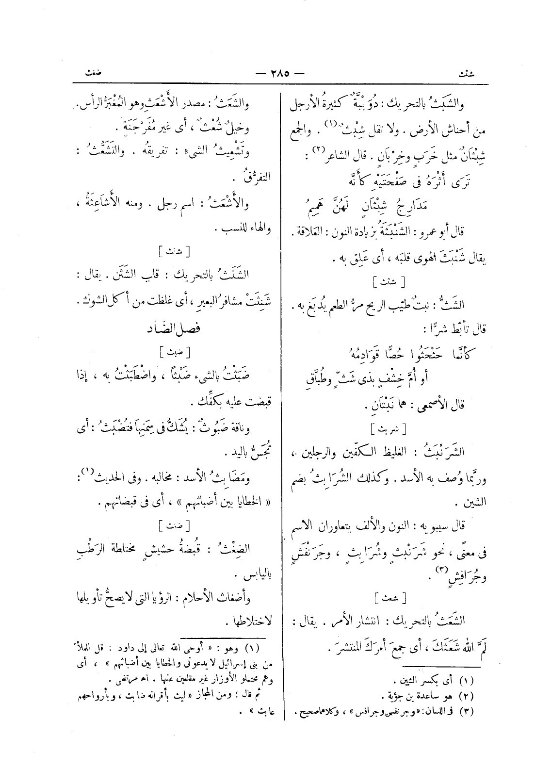 [شثث] الشَثُّ: نبتٌ طيّب الريح مرُّ الطعم يُدبَغ به. قال تأبّط شرّاً: كأنَّما حَثْحَثوا حُصّاً قَوادِمُهُ * أو أُمّ خِشْفٍ بذي شَثَّ وطُبَّاقِ قال الأصمعي: هما نبتان.